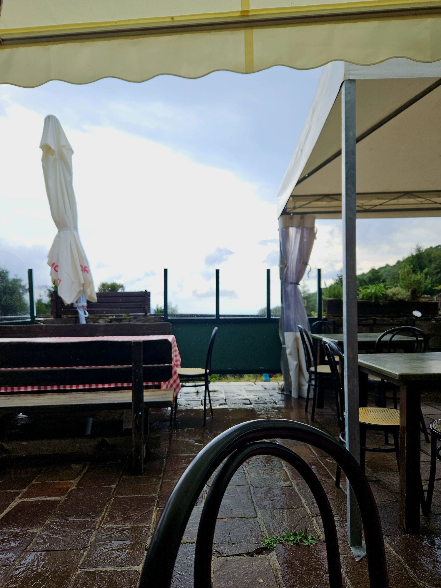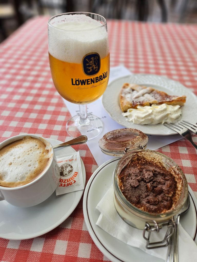 Leider wurde es etwas zu kalt und wir sind eine sog. Baita, eine Art Berghütte, ähnlich unserer Almhütten. Dort kehrten wir ein und da es in Deutschland Kaffee und Kuchenzeit war, bestellte ich einen Cappuccino (schon wieder zu so einer Unzeit ;-) und ein sehr sehr schmackhaftes Tiramisu. Kai hingegen setzte einen Kontrapunkt mit Bier und einem Stück Crostatine mit Aprikose. Jedem das Seine 🤣
