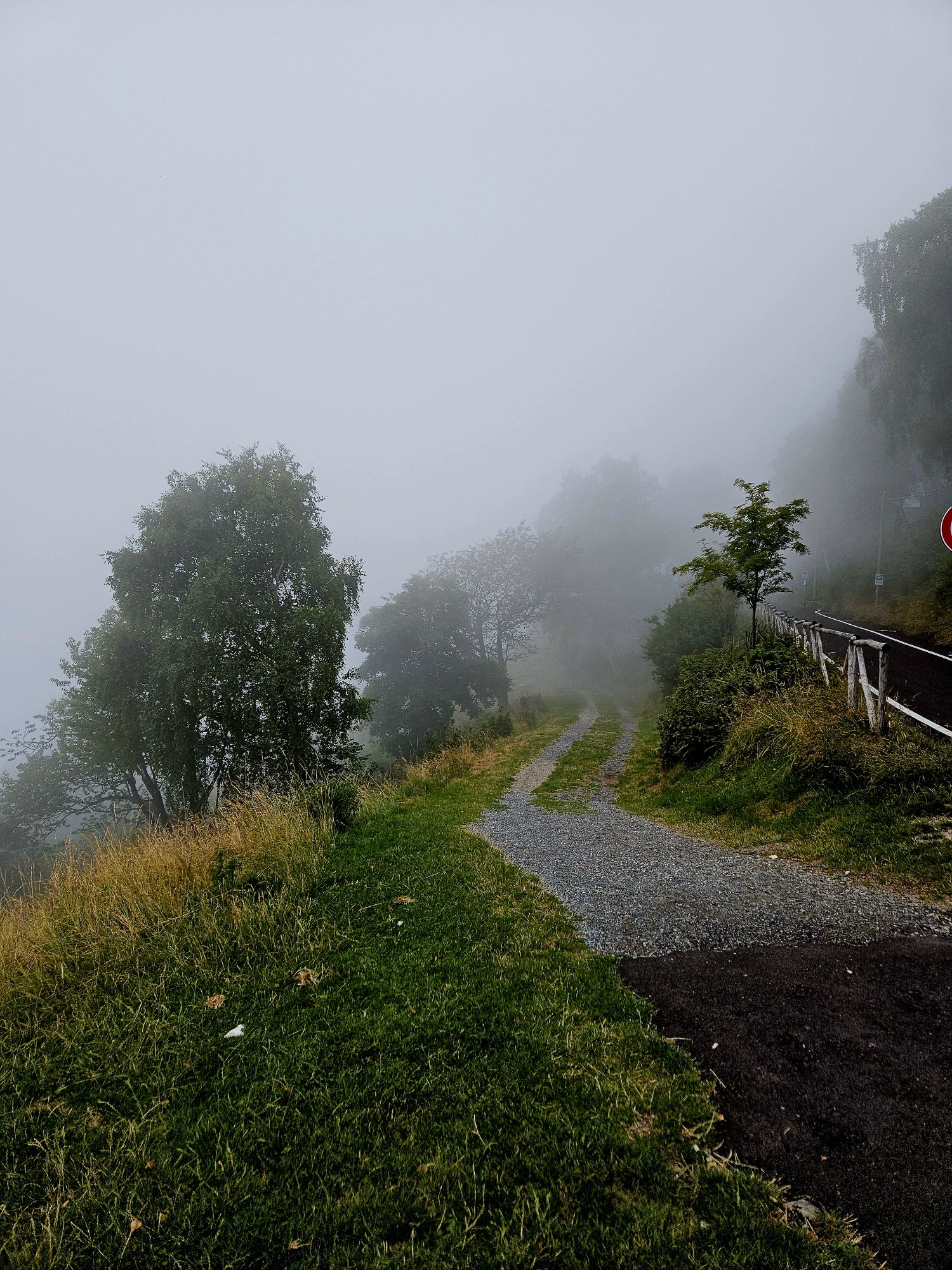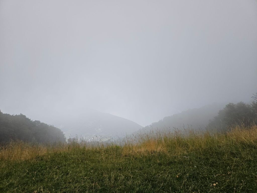 Sonntag morgen sind wir aufgewacht und alles war weg. Das Dorf und die dahinterliegenden Berge lagen tief verhüllt im Nebel. Die ganze Nacht hatte es schon geregnet und es war herrlich kühl. Der erste Tag auf unserer Reise, wo das Wetter mal nicht so schön war … und dennoch hatte diese verregnet neblige Stimmung auch ihren Charme. Ich finde regnerischen Wetter in den Bergen total schön, vielleicht weil man so weit schauen kann. Zuhause sieht man dann oft nur einen Fetzen des grauen Himmels und das kann dann schon bedrückend wirken.