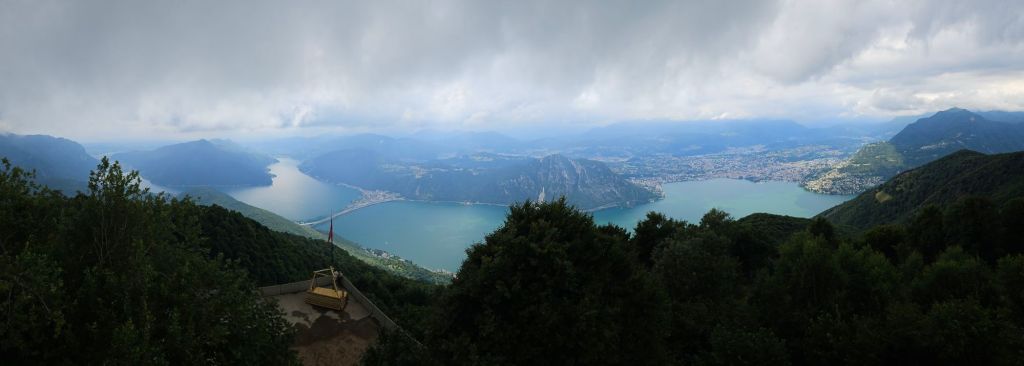 Nachmittags hat es uns dennoch nach draussen gezogen. Da das Wetter zwar ein bisschen besser wurde, aber schon wieder Regen angekündigt war, wollten wir nicht so weit weg. Also hat Kai den Aussichtspunkt Balcone D’italia ausgesucht, den man von Pellio in etwa 20 Minuten mit dem Auto erreicht. Wow, was fuer eine Aussicht. Von einem bestimmten Punkt konnte man den ganzen Luganer See überblicken. Das war echt schoen. Vor allem mit den dramatischen Wolken, die ueber See und Bergen hingen, war das ein besonders beeindruckendes Bild.