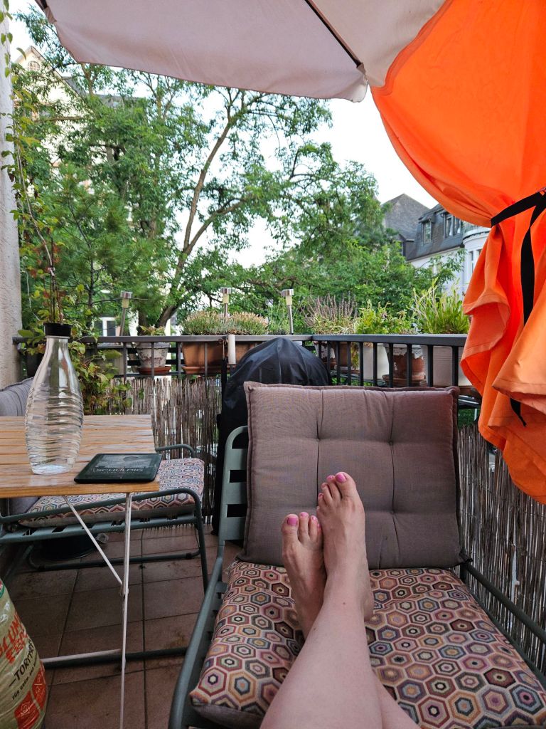 Heute ist bereits Donnerstag Abend. Die Luft ist lau, der Himmel endlich wieder blau, der Sessel steht auf dem Balkon, ein kühles Getränk an meiner Seite und ein gutes Buch im Anschluss an diesen Beitrag. So kann man es eigentlich auch hier aushalten.