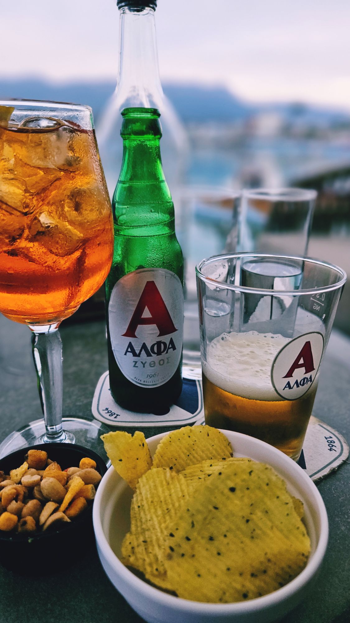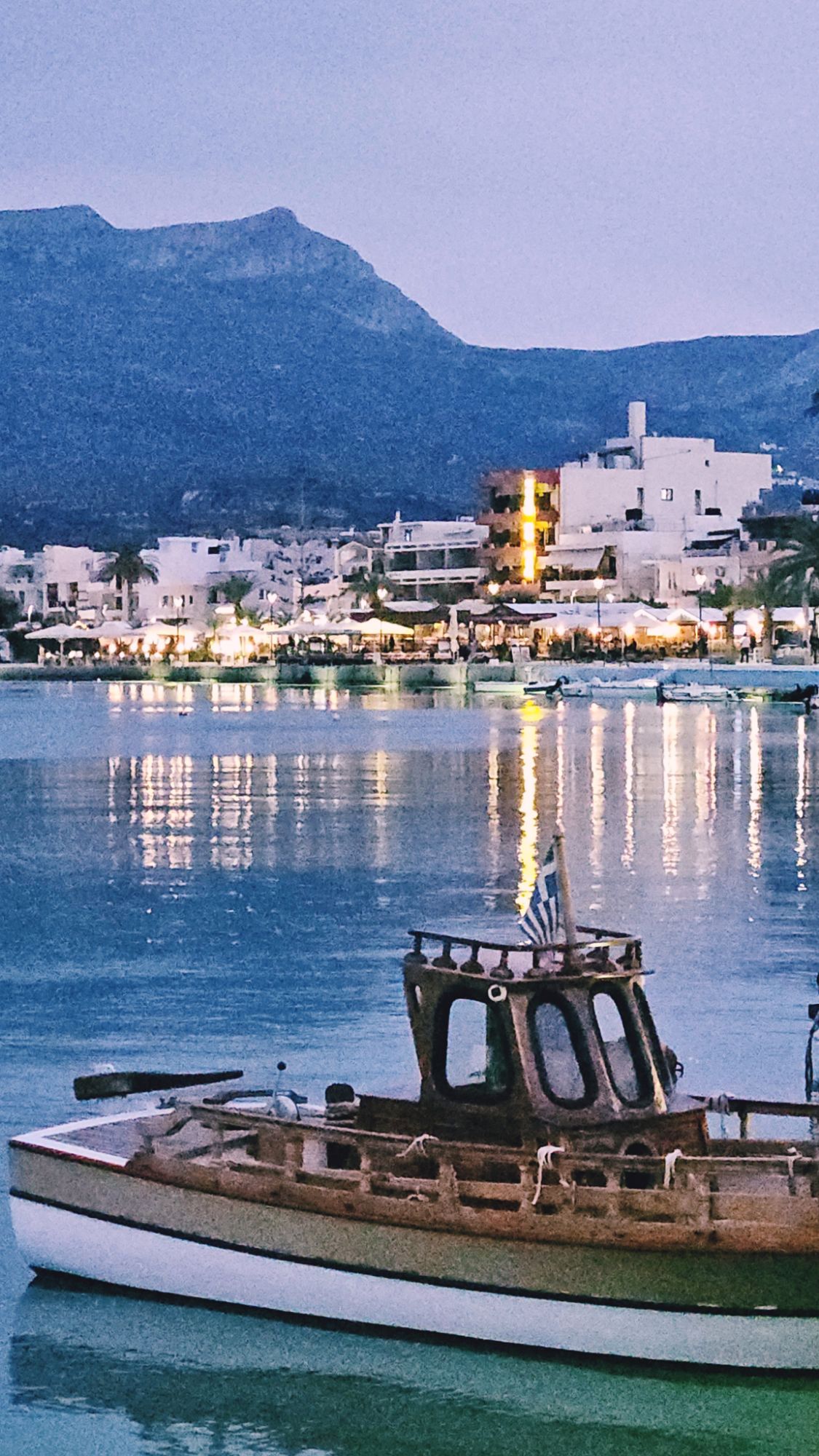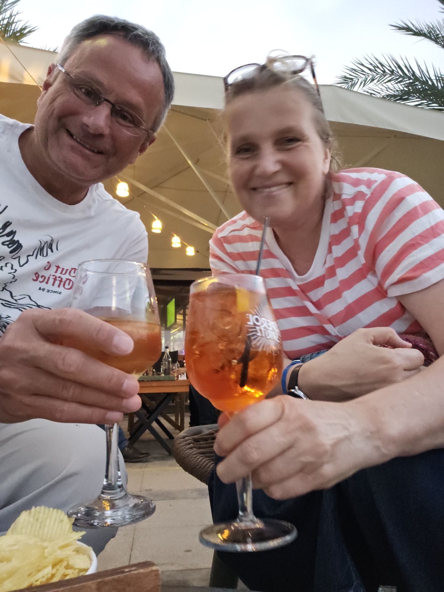 Der abendliche Aperol an der schoenen Hafenpromenade von Sitia. Haetten wir ein so schönes Kleinod auch zuhause, sässen wir sicher öfter dort.