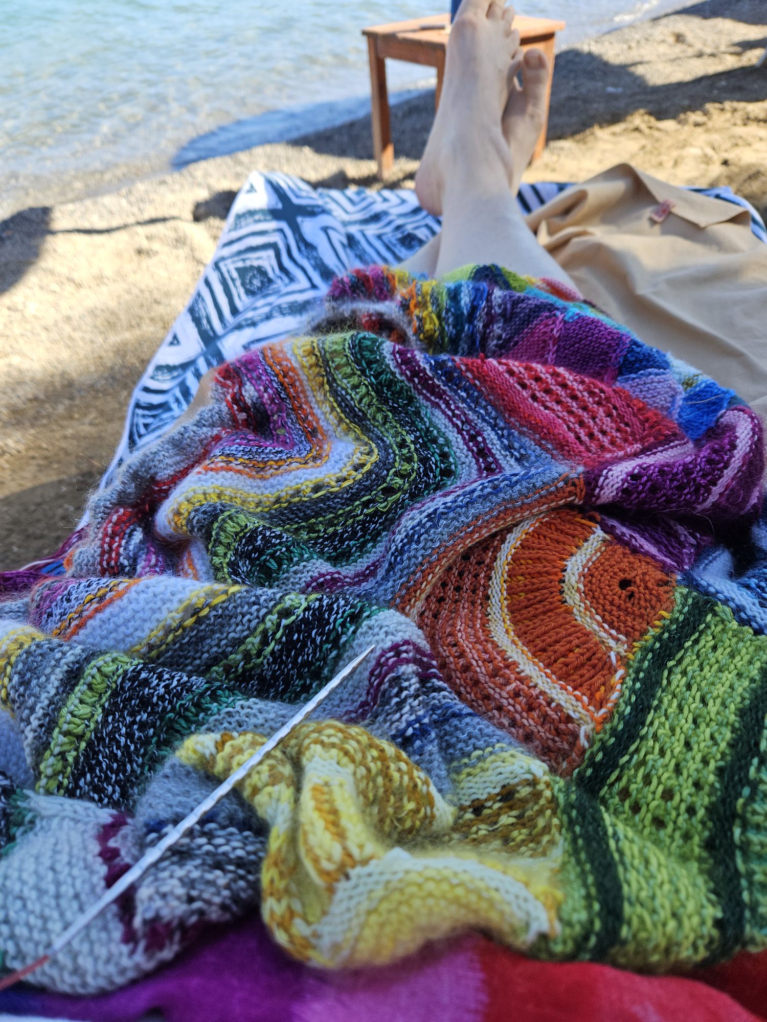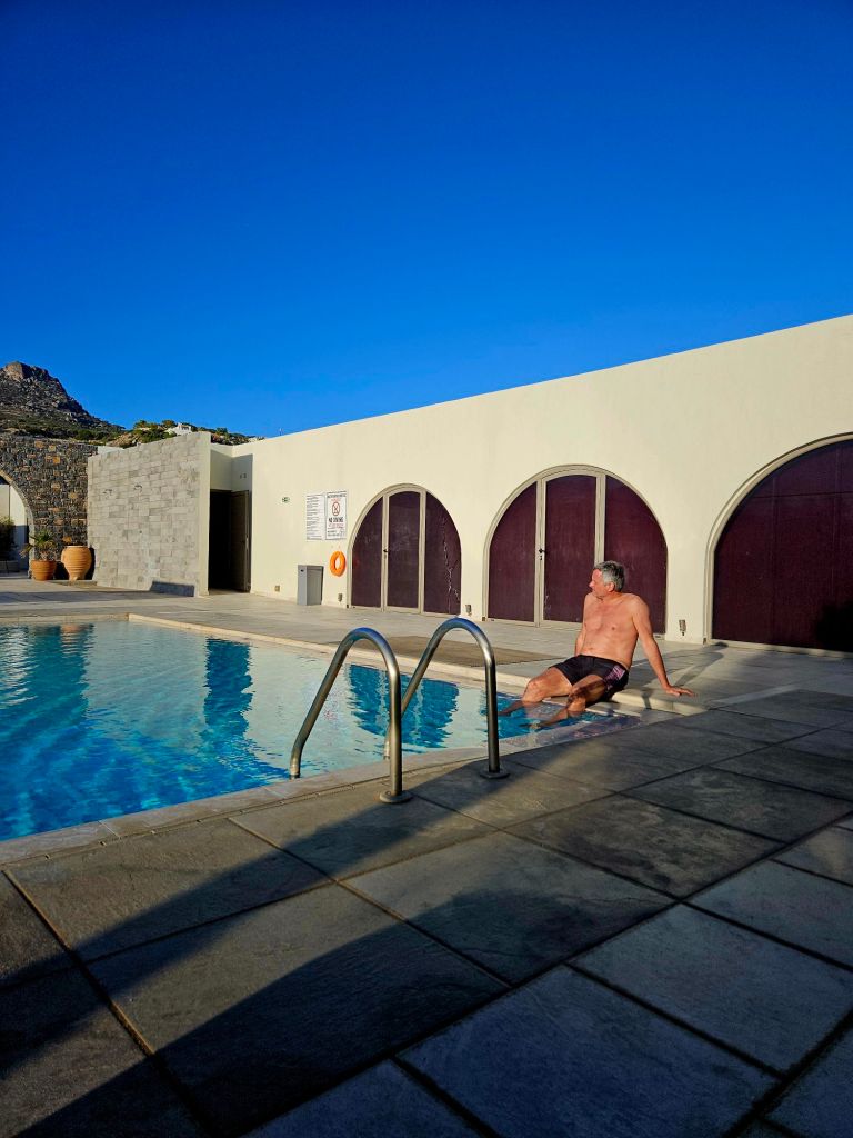 Danach muss ich immer nochmal Nachschlafen, denn ich kann nach dem Morgenorogramm kaum noch die Augen aufhalten. Kai geht dann immer schon mal vor ans Meer oder an den Pool. Nachdem ich ausgeschlafen habe ist ein Bad im Pool genau das richtige, um die Lebensgeister einigermaßen zu aktivieren. Leichtes Stricken ist angesagt und dazu ein Hörbuch auf den Ohren. So dazusitzen, ab und zu mal ins Wasser gehen, zwischendurch einen Freddo Cappuccino trinken, da ist meine kleine Welt in Ordnung. Ich liebe das so sehr.