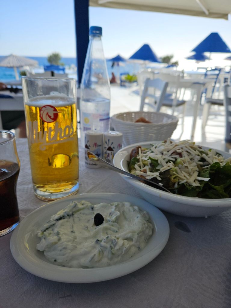 Vorne am Strand gibt es ein kleines griechisches Lokal, dass noch geöffnet hat und das (fuer Kai sehr wichtige ;-) blau weiss getünchte Lokalkolorit ausstrahlt. Der leckere ueberbackene Käse, dazu einen frischen griechischen oder kretischen Salat, so kann man die lange Zeit zwischen Fruehstueck und Abendessen gut aushalten.