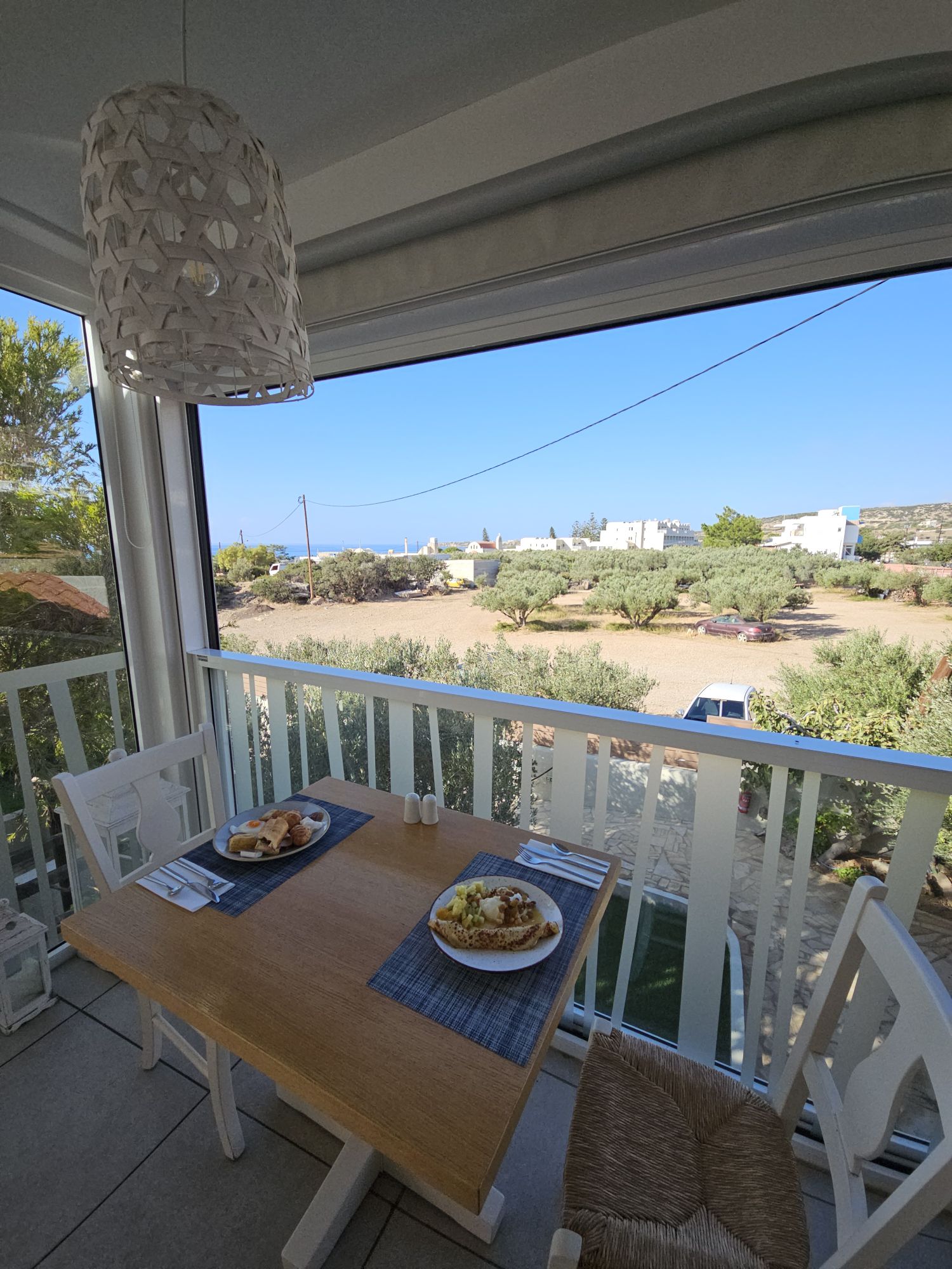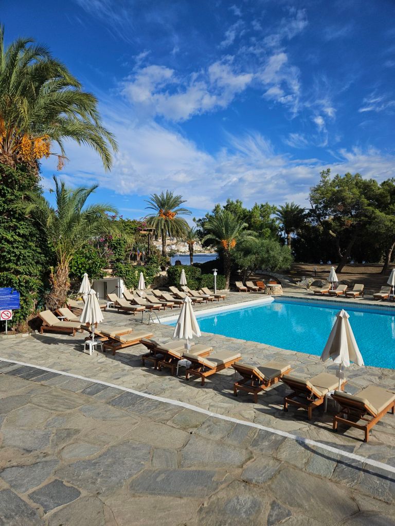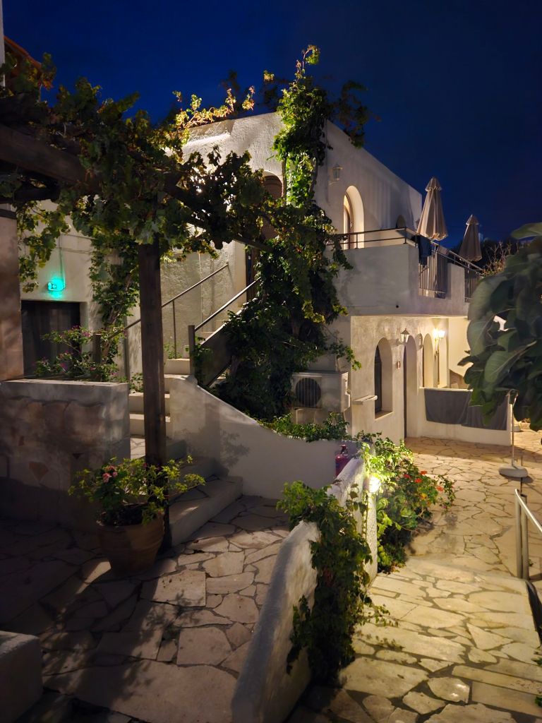 Die Anlage hier besteht aus kleinen Bungalows, die eng aneinander gebaut sind und irgendwie den Stil einen kleinen griechischen Dorfes abbilden. Dennoch hat jedes Zimmer genügend Privatsphäre. Idyllischer geht es kaum. Wir hatten dieses Etablissemnt eigentlich ohne Meerblick gebucht. Umso erstaunter waren wir, als wir in den ersten Stock gingen und eines der wenigen Zimmer mit dem Blick auf das grosse weite Blau bekamen. Ich war begeistert. Die Dame sagte dann, es sei ja kurz vor Saisonende und warum sollten wir nicht eines ihrer schönsten Zimmer beziehen.