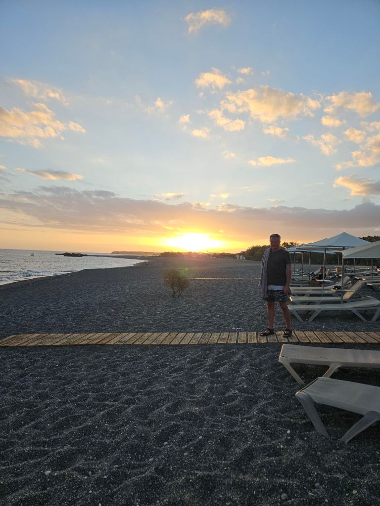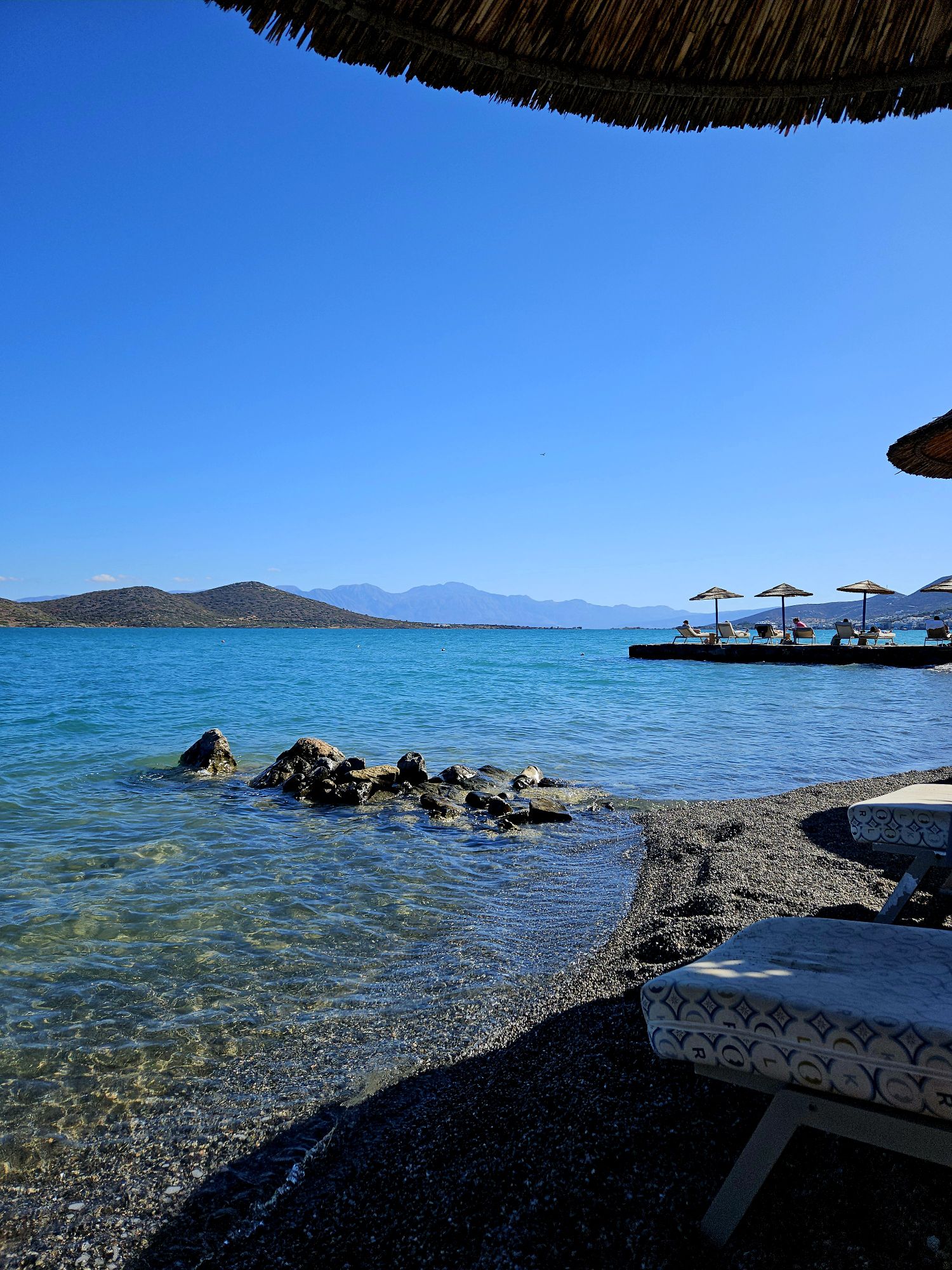Nach dem Frühstück gehen wir dann „immer“ an den kleinen Strand, der dem Hotel angehört. Dort gibt es auch watteweiche Liegen und ein ruhiges plaetscherndes Meer.