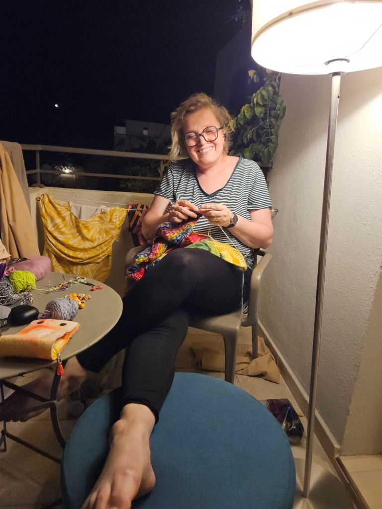Am Abend sitzen wir noch eine Weile auf dem Balkon und ich schleppe dann immer die stehlampe und eine Fussablage raus, so kann man den Abend wundervoll geniessen. Das Strickzeug darf natuerlich auch nicht fehlen.