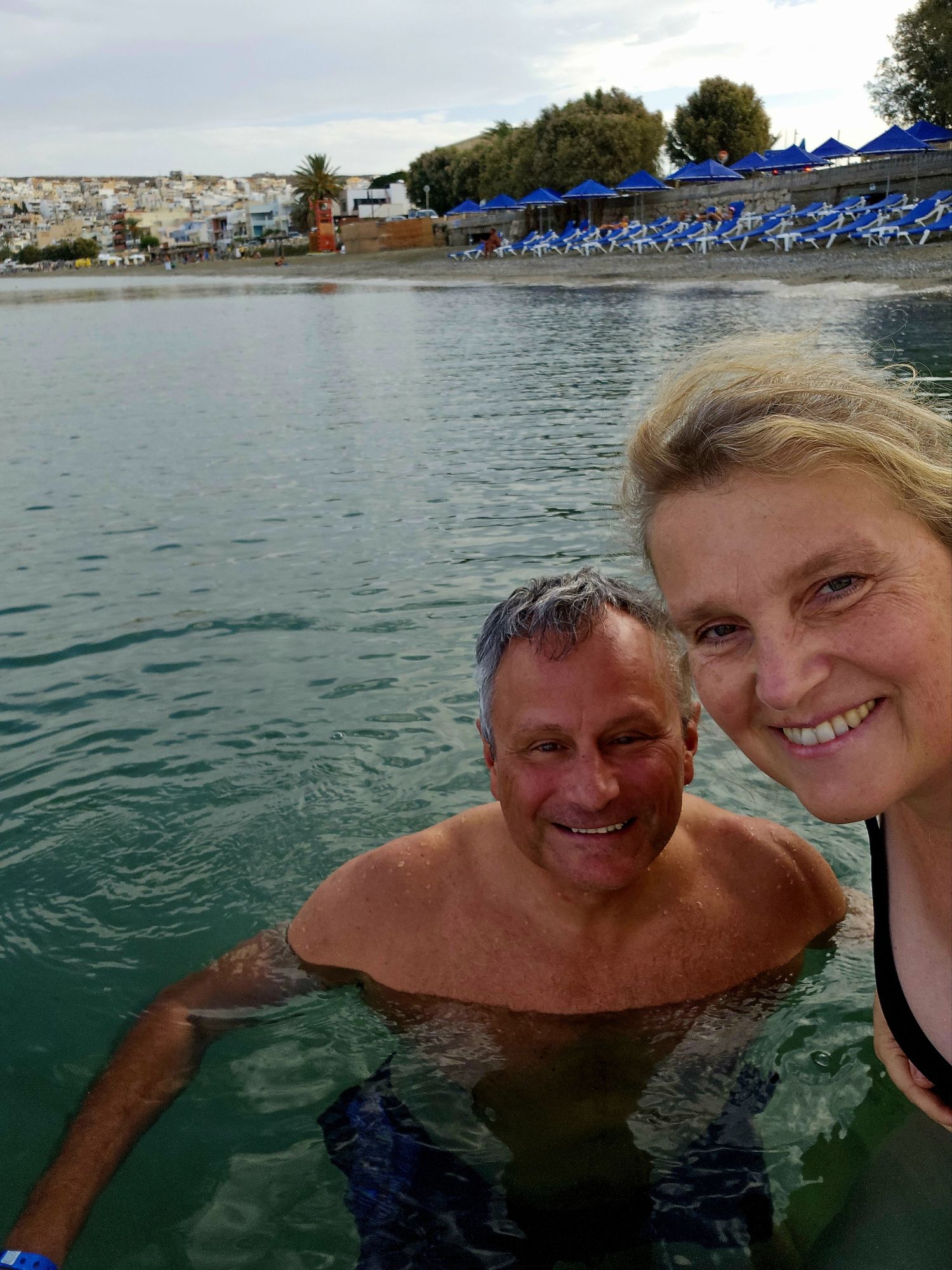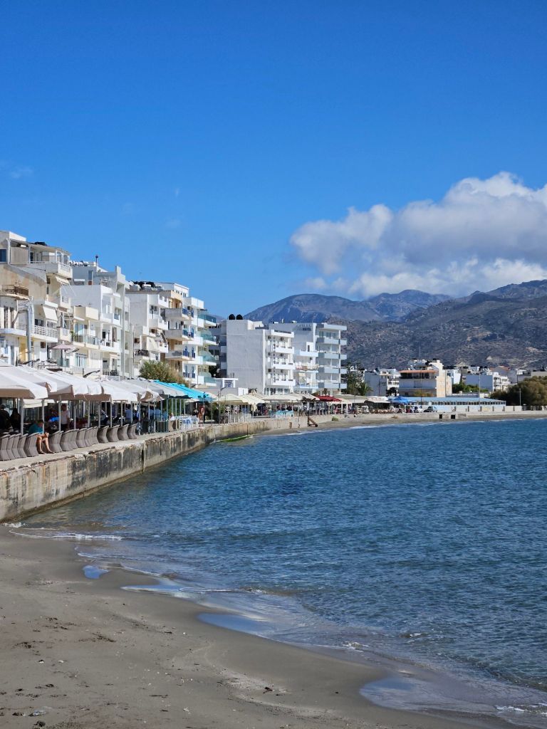 Der Rest der bisherigen Reise ist schnell erzählt. Am Morgen gehen wir gerne im Meer baden. Das ist hier aber auch wirklich toll, total klares Wasser und sandiger Boden, die Wassertemperatur beträgt noch angenehme 20 Grad. Nach dem Morgenplanschen gehen wir frühstücken. Man kann hier draussen auf einer schönen Terrasse sitzen und sieht dabei auf den Pool und im Hintergrund das Meer und die weißen Würfelhäuser der Kleinstadt Sitia.