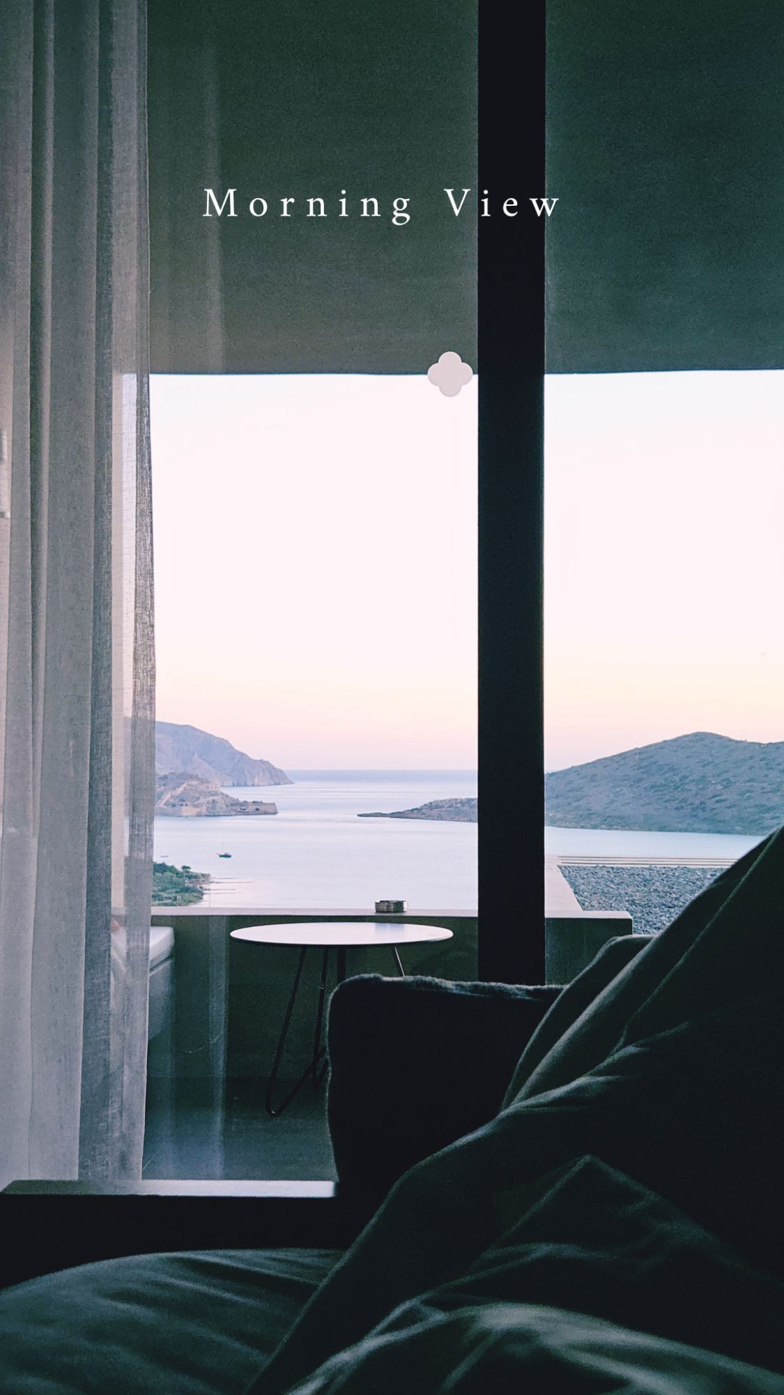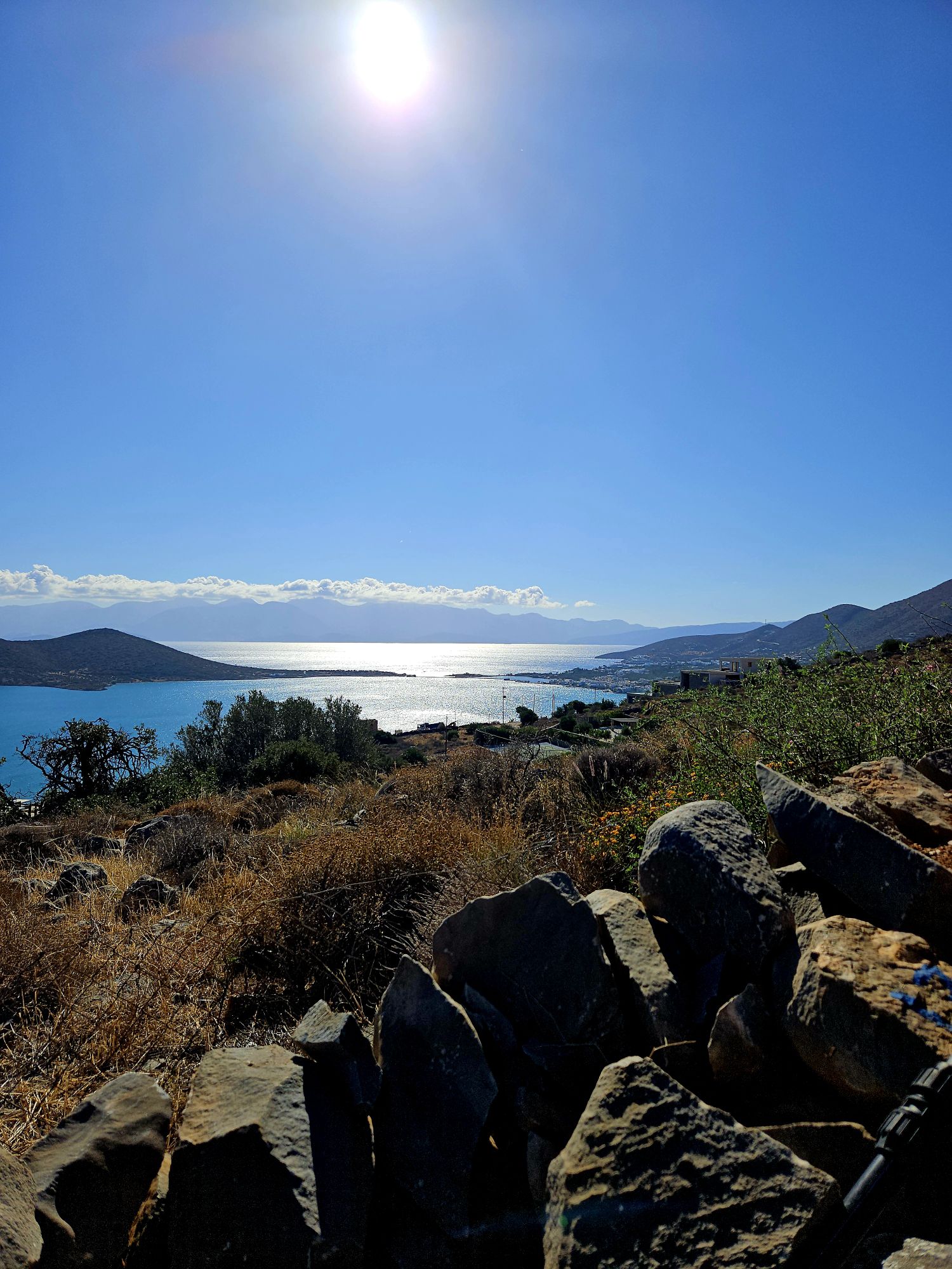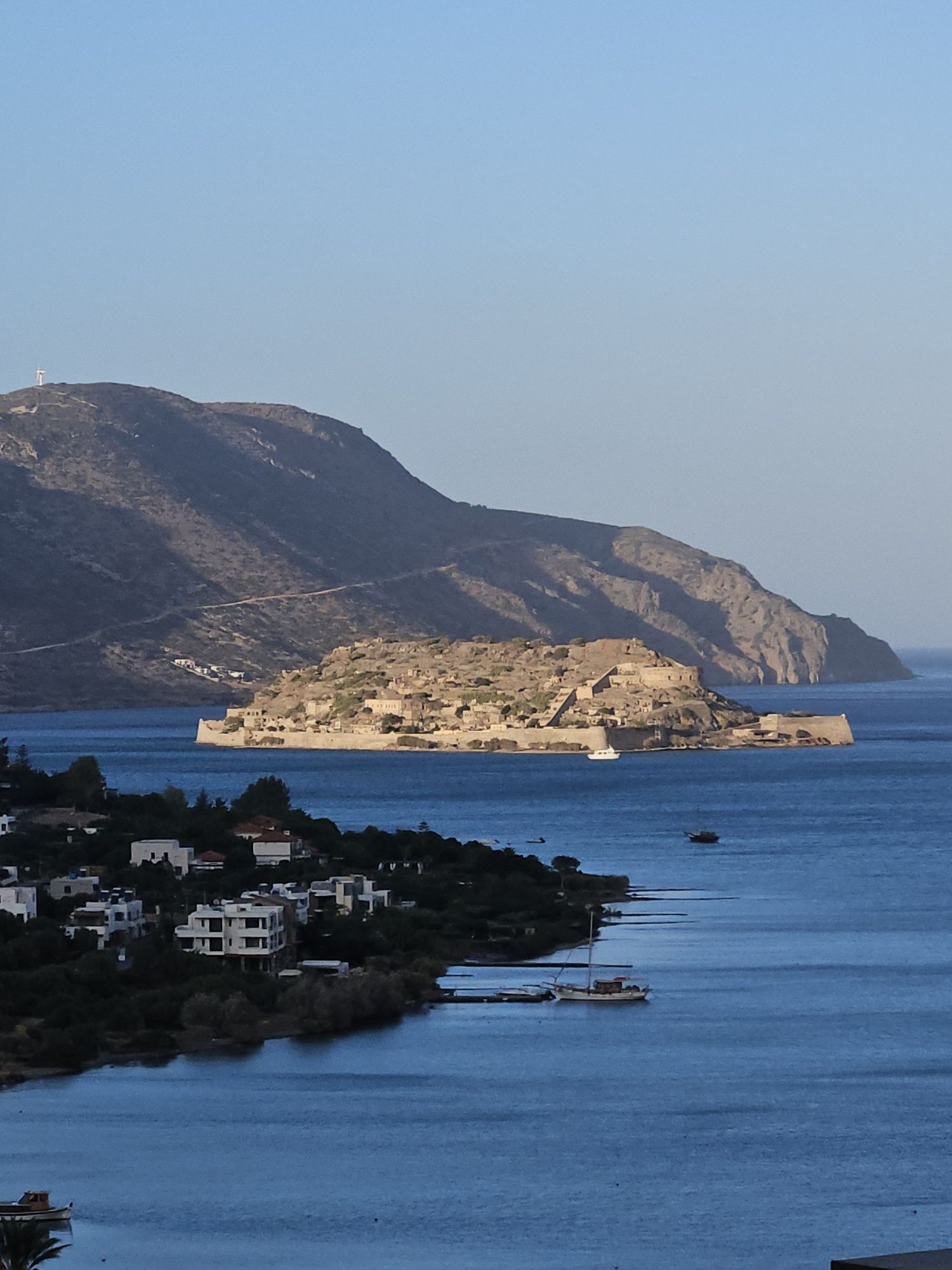 Blick aus dem Zimmer auf die kleine Insel Spinalonga, die zu Beginn des letzten Jahrhunderts unter anderem zum Aufenthalt von Leprakranken diente. Jetzt sind es nur noch verlassene Ruinen. Die gesamte Aussicht hier aus dem Zimmer und oben vom Berg ist so wunderschön, dass wir uns beide nicht daran sattsehen koennen.