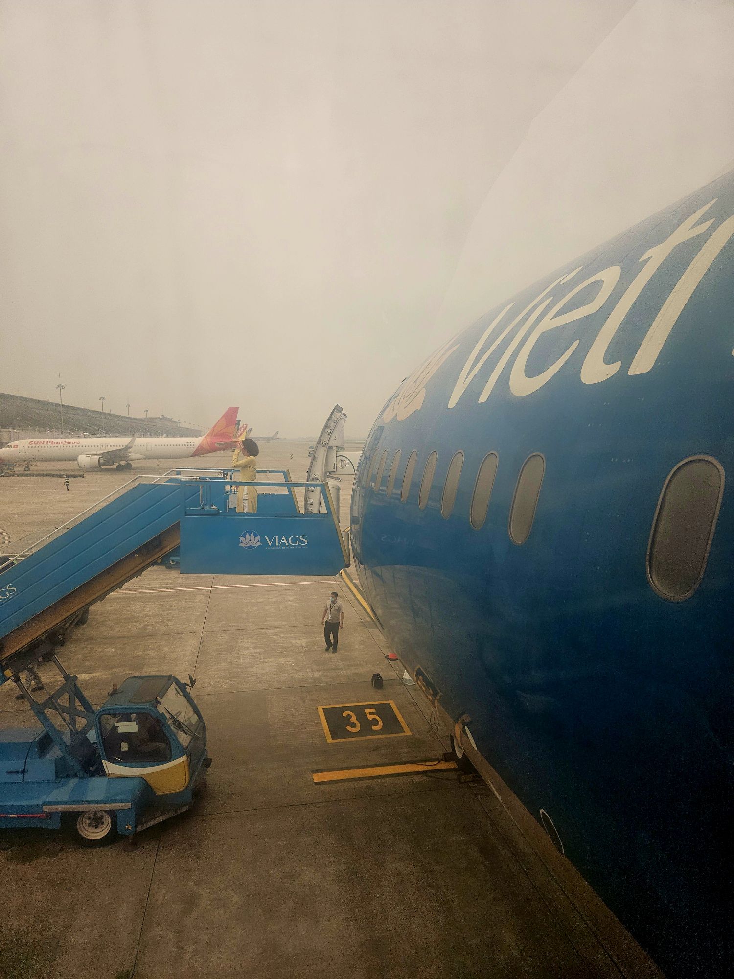 Wenn man weiss, dass man zwei Langstreckenfluege hintereinander überstehen muss, dann kommt einem nur einer davon plötzlich sehr viel kürzer vor. Wir haben nett mit den Sitznachbarn geplaudert, ein paar Filme angeschaut und schwupsdiwups waren wir auch schon in Hanoi. Da war es ca. 6.30 Ortszeit. Good Morning Vietnam. Die Luft war zum Schneiden dick, und das war irgendwie toll wenn man aus dem klimatisierten Flugzeug steigt. Am Flughafen gab es erst mal einen leckeren Kaffee und ein paar News aus der Heimat, wir konnten uns die Beine vertreten und uns im Bad etwas frisch machen.