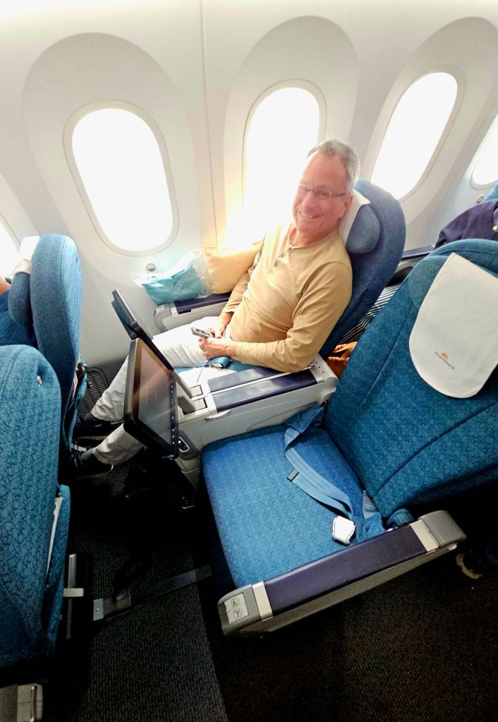 Am Mittwoch vormittag sind wir gegen 11 in unserer Wohnung aufgebrochen, mit dem Bus zum Terminal 2 gefahren, haben die Koffer eingecheckt und uns durch Pass- und Sicherheitskontrolle bewegt. Obwohl wir 3 Stunden vor Abflug von Zuhause los gegangen sind, sassen wir gerade mal 15 Minuten am Gate, da ging auch schon das Boarding los. In unserem Fall Priority, weil wir uns fuer diese lange Reise Premium Economy gegoennt haben. Entsprechend verzückt war ich auch, als wir die Sitze gesehen haben. Wirklich sehr bequem, mit ein Sitzabstand von 104 cm, da kann man nicht meckern.