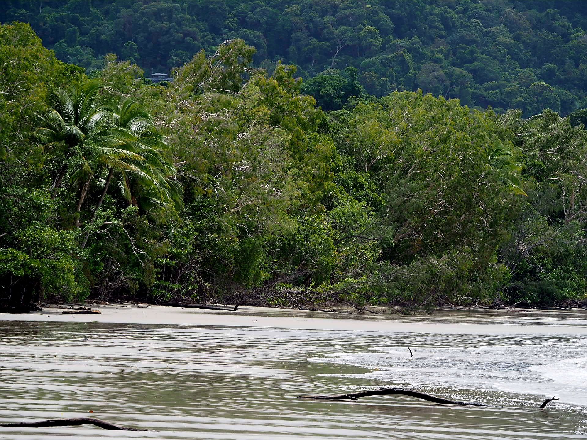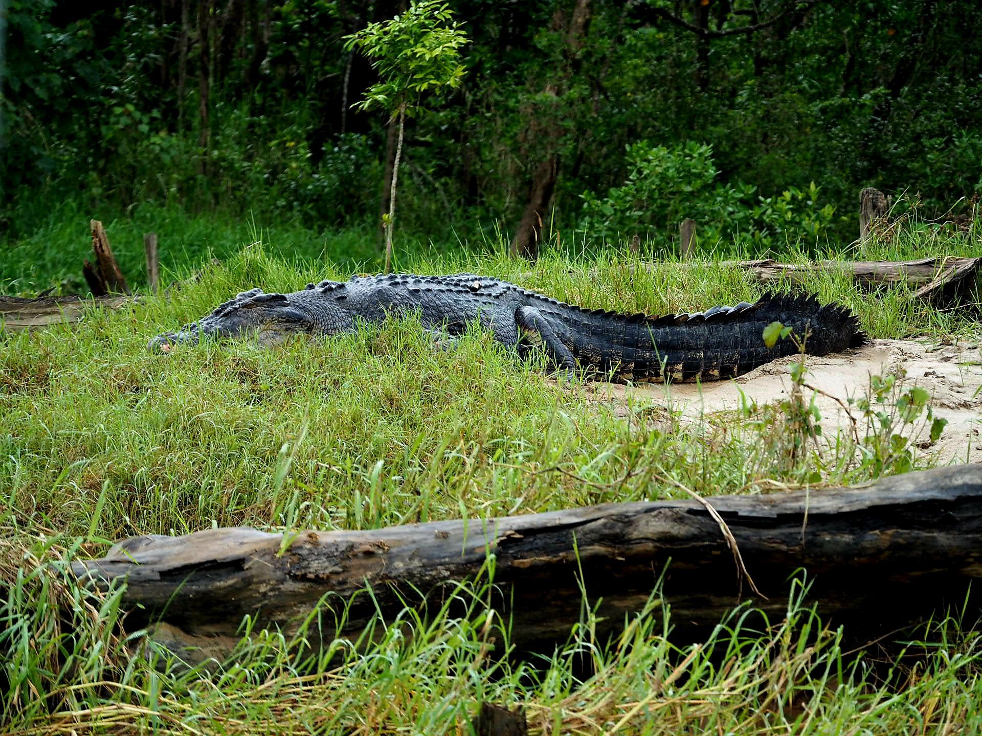 Das absolute Highlight des Tages sollte jedoch noch kommen, eine etwa einstündige Fahrt auf dem Daintree Fluss, in dem einige Exemplare des größten lebenden Salzwasserkrokodils beheimatet sind. Man hat uns keine grosse Hoffnung auf eine Sichtung gemacht, da die Brühe vom vielen Regen braun war und der Wasserstand entrprechend hoch. Naja, egal, die Fahrt war trotzdem schoen. Aber dann, was war das, unsere Bootsführer steuerte eine Sandbank am Ufer an und da lag er, ein männliches ca. 5 m langes Exemplar eines australischen Salzwasser-Leistenkrokodils. Verrückt und absolut atemberaubend. So faszinierend er auch aussieht, dem moechte man nicht zu Nahe kommen. Der reißt einem nicht nur mal eben ein Bein aus. Wenn er seine Beute hat, dann wird diese erstmal ertränkt und mit der sogenannten Todesrolle (kennt man sicher aus dem Fernsehen) in seine Einzelteile zerlegt. Huiuiui. Nein, ich betone nochmals. Ins Wasser gehen wir hier nicht.