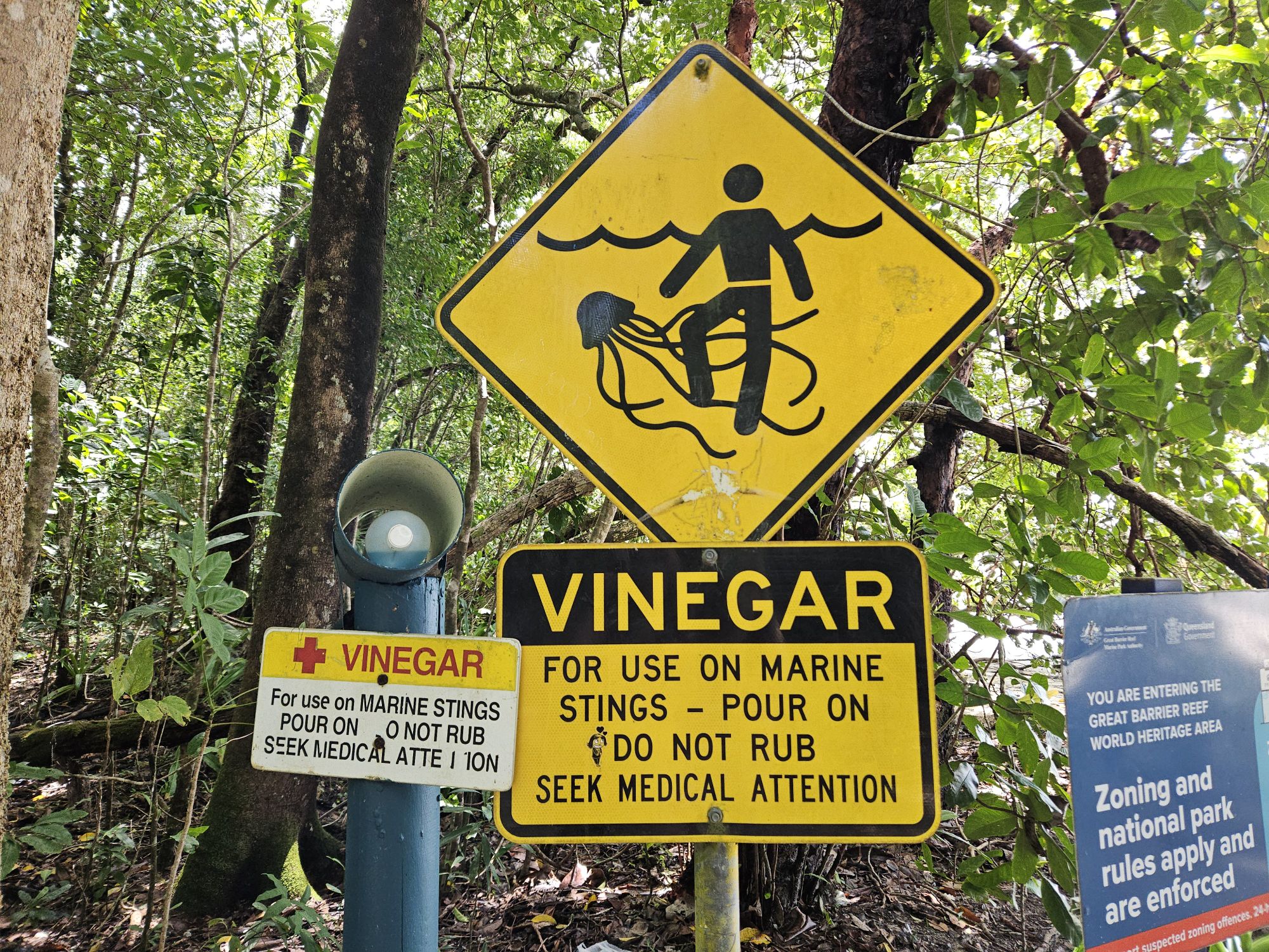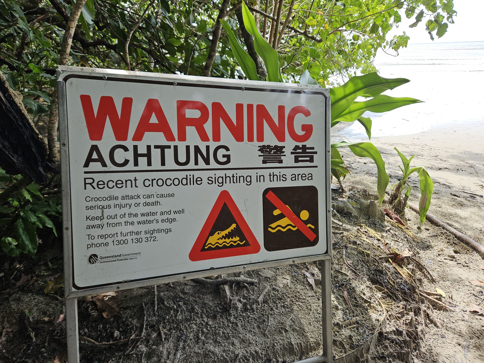Später zurück am Ufer dann die Warnschilder vor Krokodilen und den extrem gefährlichen Würfelquallen. Nein nein nein, schwimmen im Meer ist leider gar nicht möglich.