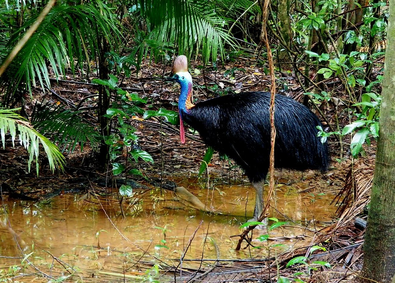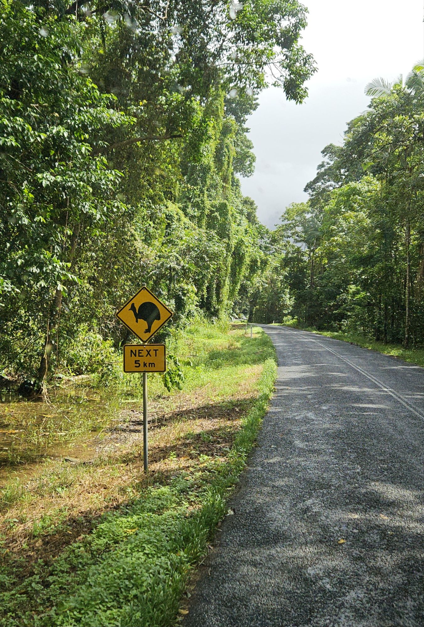 Die Schilder, die hier vor Wildwechsel warnen, zieren ein Bild des im Busch verbreiteten Cassowary, einem flugunfähigen Laufvogel. Eine direkte Sichtung ist jedoch gar nicht sicher. Umso aufgeregt waren alle, als direkt neben unserem Parkplatz am naechsten Stop ein besonders grosses Exemplar in all seiner Pracht seelenruhig dort stand und uns neugierig anschaute.
