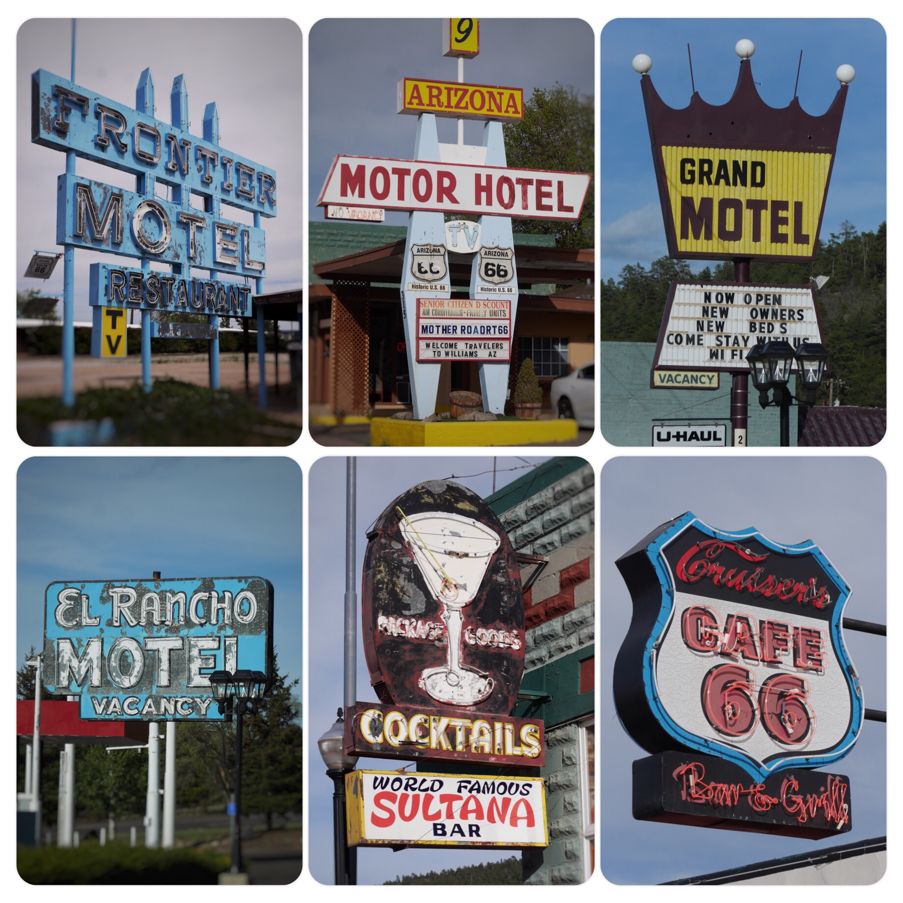 Der Donnerstag war ein sehr langer Tag im Auto, das wussten wir und war auch so geplant. Aber irgendwie mussten wir ja hoch zu den roten Steinen kommen und dazwischen auf der Strecke war nicht soviel. Also hieß es Zähne zusammenbeißen und die ca. 650 Kilometer durchhalten. Dennoch konnte man es genießen. Irgendwie war es auch gemütlich. Die Straßen wurden immer einsamer und verlassener. Irgendwann sind wir dann sogar ein kleines Stückchen auf der berühmten alten Route 66 gefahren. Dort haben mir vor allem die vielen sehr vielseitigen alten Motel Schilder gefallen. Für Schilder hab ich ja irgendwie was übrig.