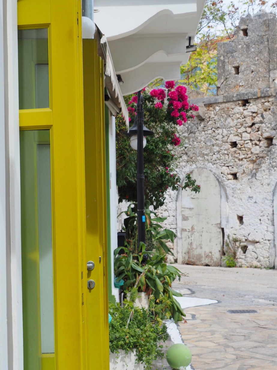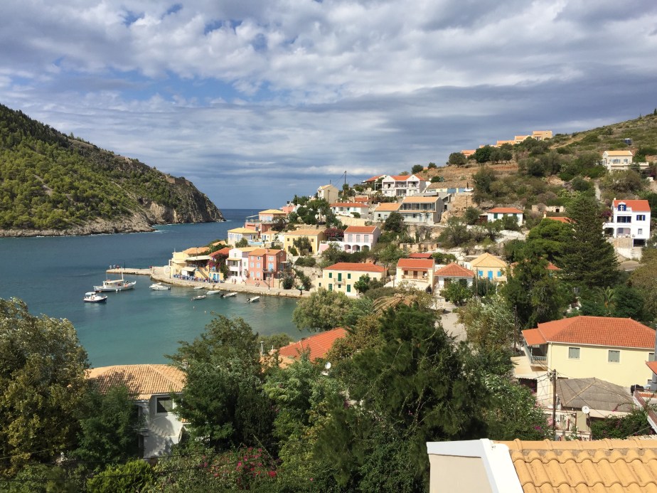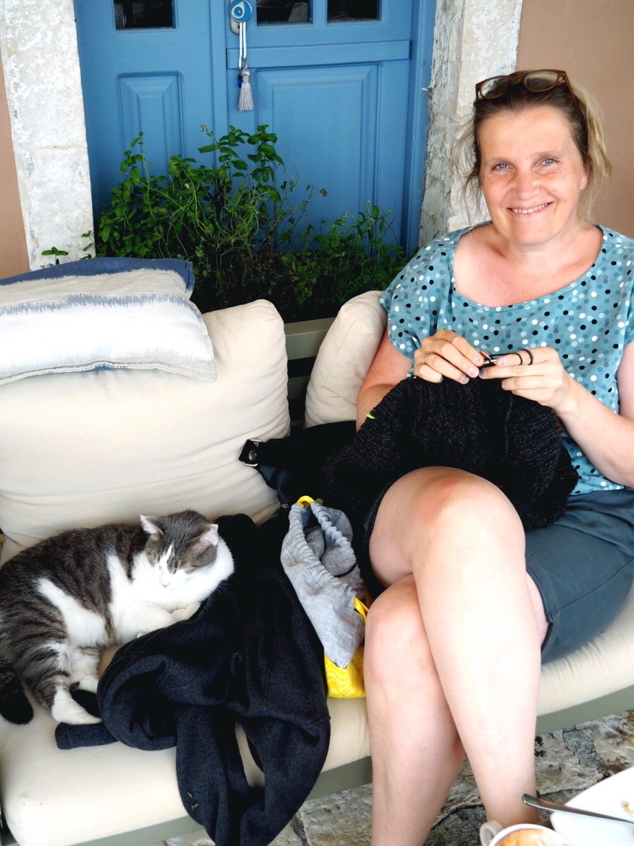 Danach sind wir etwas weiter nördlich gefahren. In einem kleinen Ort namens Assos haben wir uns in einem schnuckeligen Hotel eingemietet mit traumhaften Blick auf die Bucht und den kleinen Häuserhaufen. Dort gab es sooo viele Katzen. Am liebsten hätte ich ein paar davon mitgenommen. Wir waren ein Tag am bekanntesten Strand der Insel, dem Myrtos Beach. Wenn man den Strand von oben sieht, ist man von den unglaublichen Farben beeindruckt. Strahlend weißer Sand und Kieselsteine und ein leuchtend blaues Meer … wahnsinnig schön. Unten am Strand haben wir dann ein Schirmchen gemietet und den Tag genossen. Am zweiten Tag in Assos kam dann der Wetterumschwung und der Wind hat sich verstärkt. Wir haben sogar überlegt, ob wir überhaupt rumfahren, aber etwas Recherche im Internet hat ergeben, das wie nur am Rande des Geschehens waren. So verbrachten wir den Nachmittag hoch im Norden der Insel in einem etwas nobler anmutenden Ort namens Fiskardo. Bei einer Kaffeepause holte ich mein Strickzeug raus, und ein grau weiß gefleckter großer Kater gesellte sich neben mich auf Sofa und schlief, als ob wir schon immer beste Freunde gewesen wären. Sogar Bauchi kraulen durfte ich. Ein offensichtliches Zeichen, dass er die Nähe zum Menschen gewohnt ist.