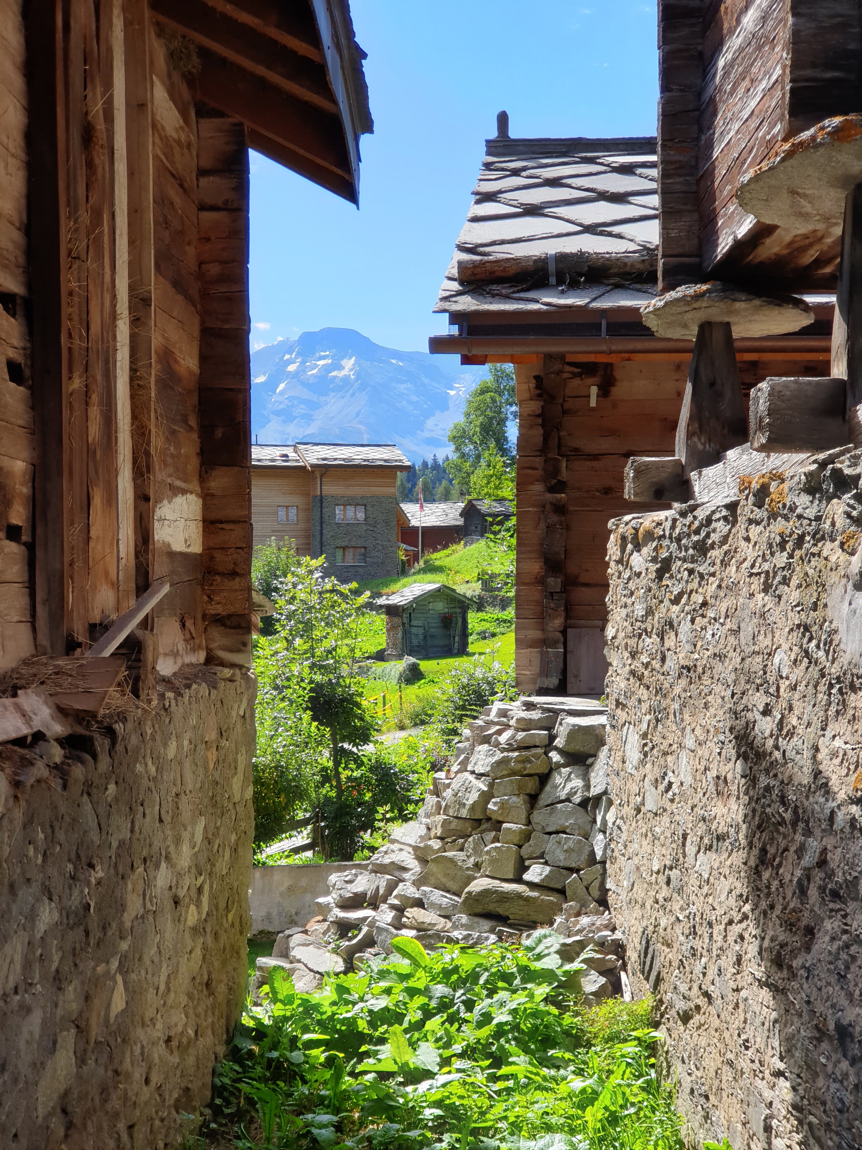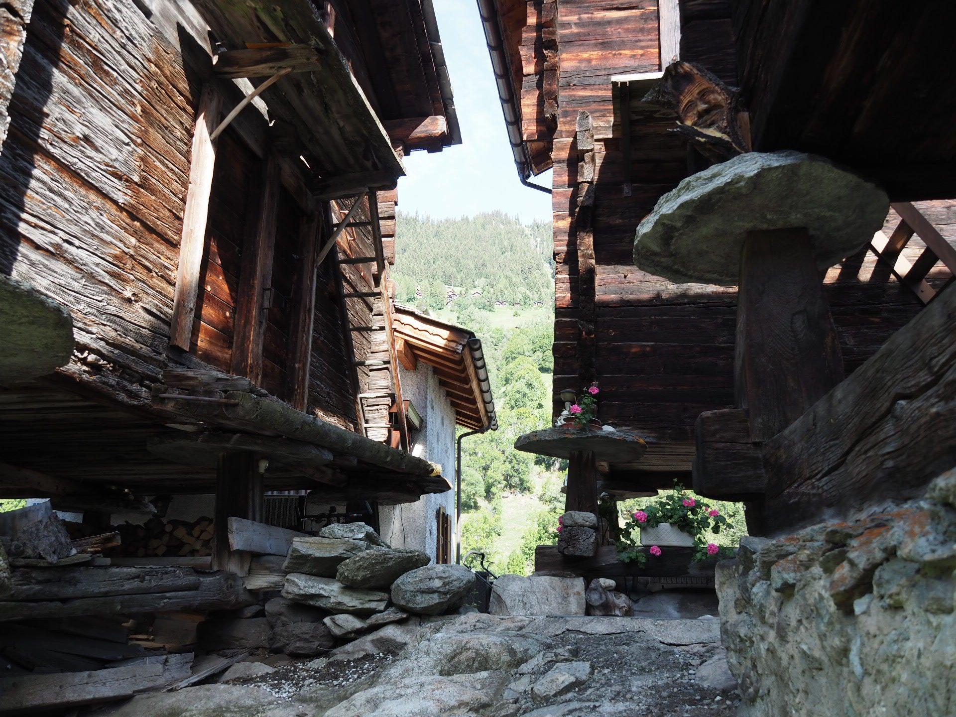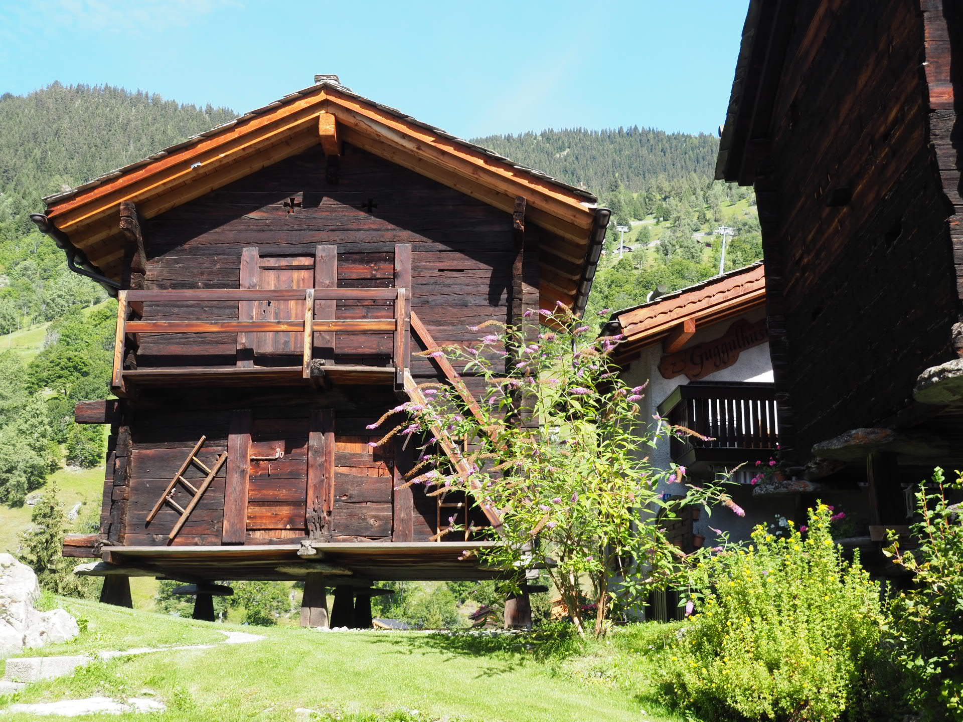 Wir fuhren die Seilbahn nach Blatten hinunter und wollten uns dort den historischen Ortskern etwas näher anschauen. Überall im Tal konnte man schon die oft sehr gut erhaltenen und liebevoll restaurierten Holzhäuser sehen. Teilweise sind diese auf Holzpfählen und grossen Steinscheiben aufgebockt. Das machte man wohl früher so, um Mäuse daran zu hindern, die Wintervorräte aufzufuttern.