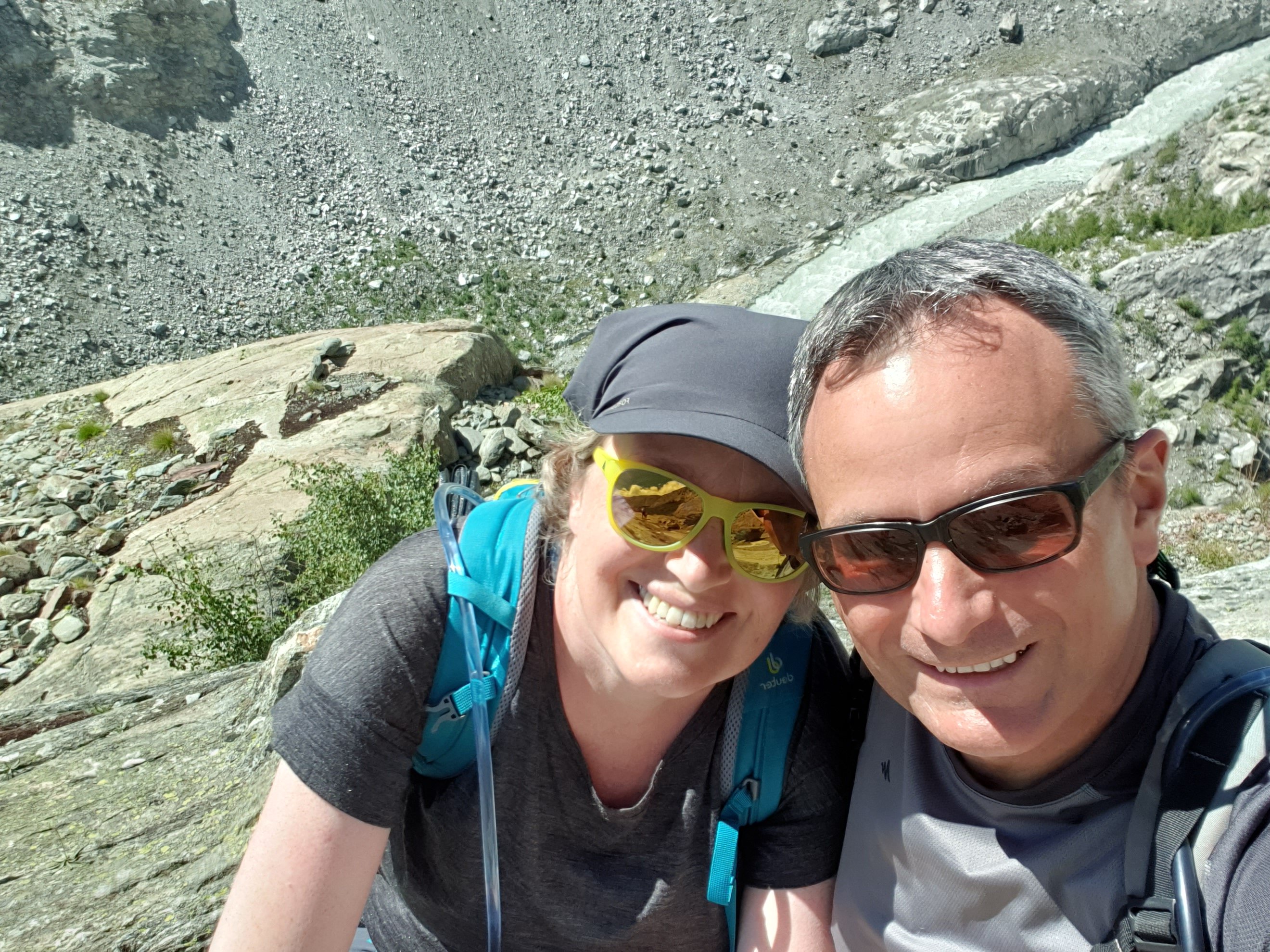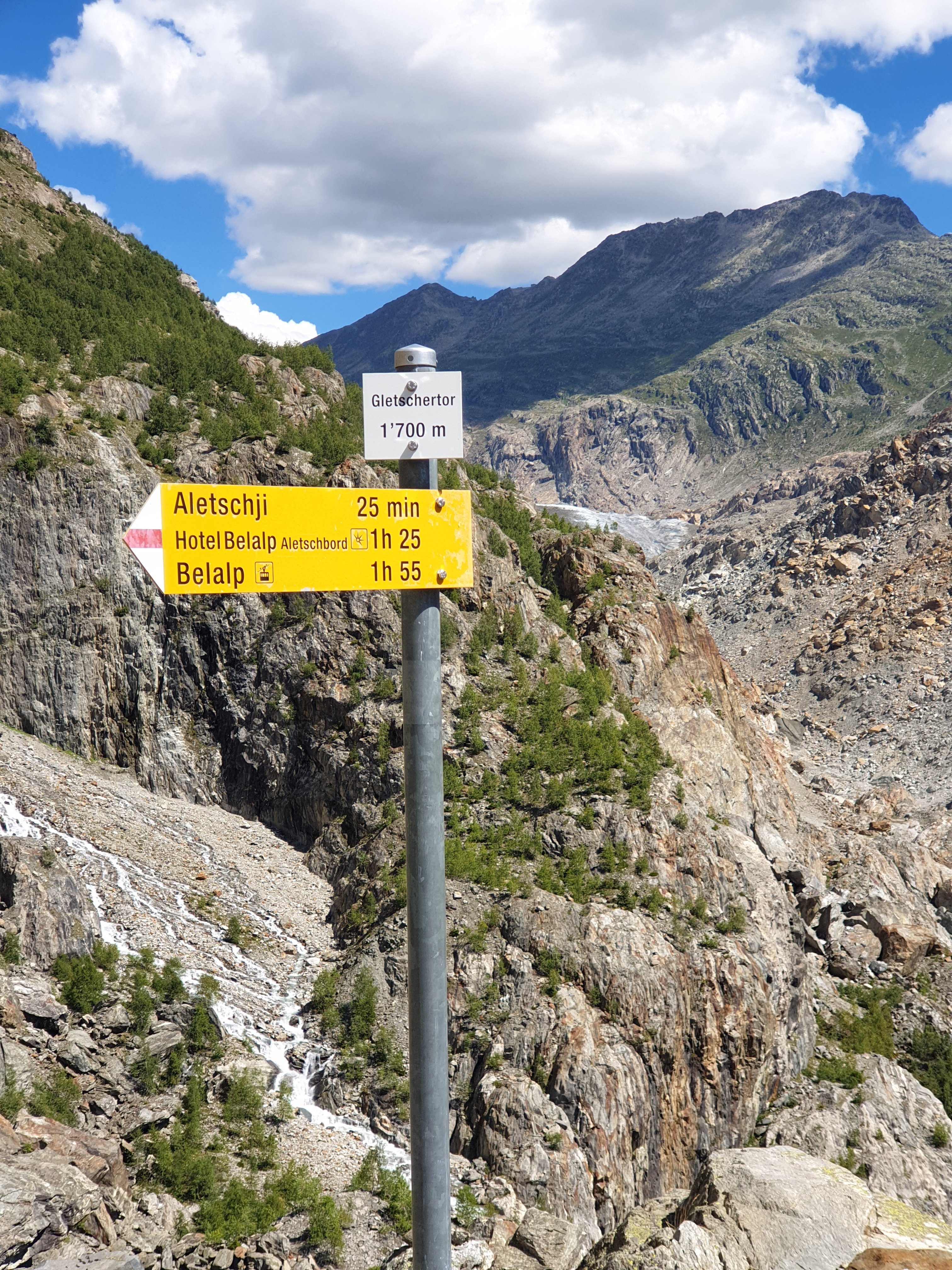 Die Vernunft siegte, und wir beschlossen, meine Kräfte zu schonen und wieder umzukehren. So machten wir eine kurze Rast mit Blick auf das Tor des Aletschgletschers. Herr C. stopfte zur Stärkung gleich zwei von diesen Fruchtriegeln in meinen Mund und ich spuelte alles mit klarem Gebirgswasser runter.