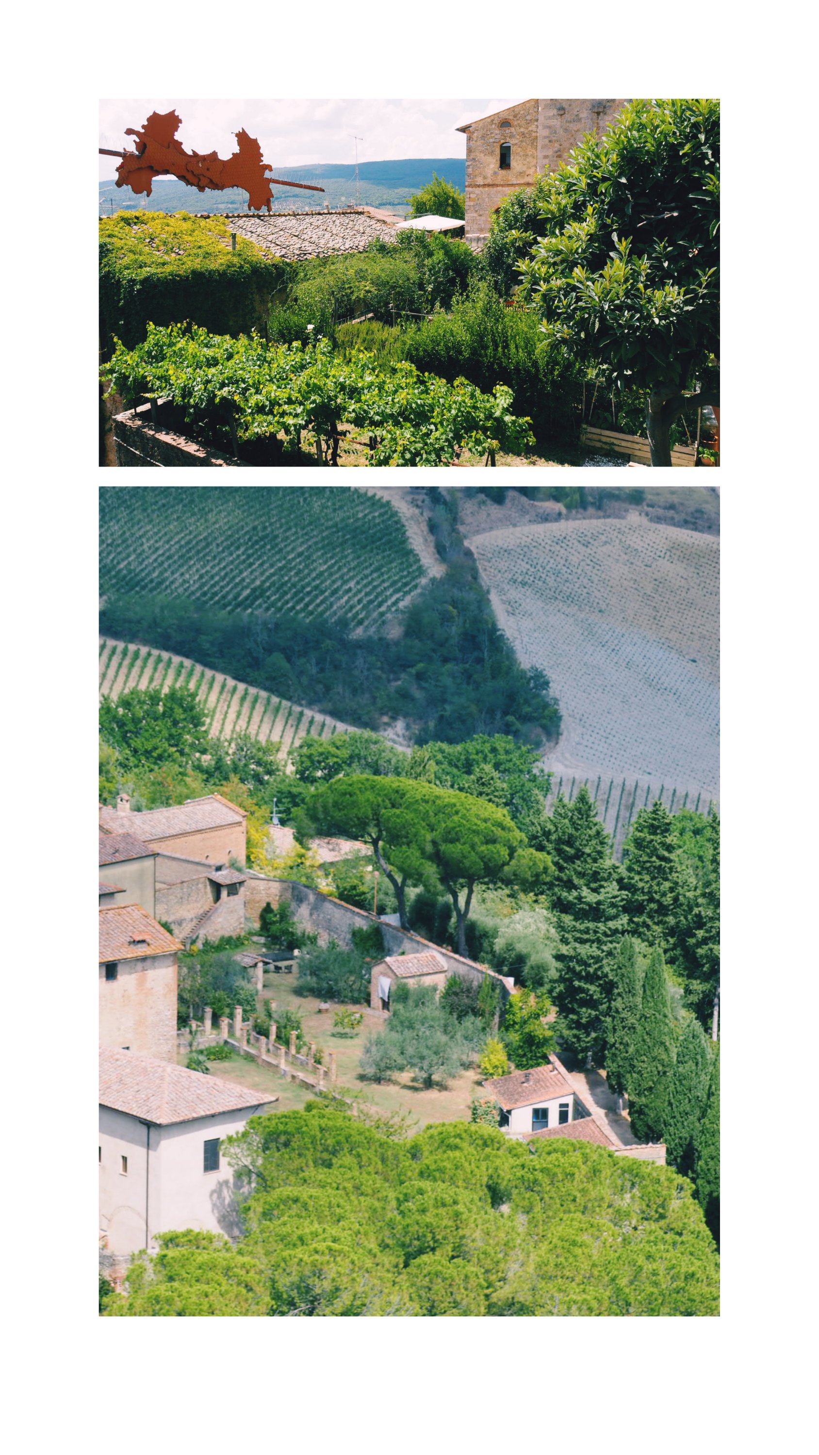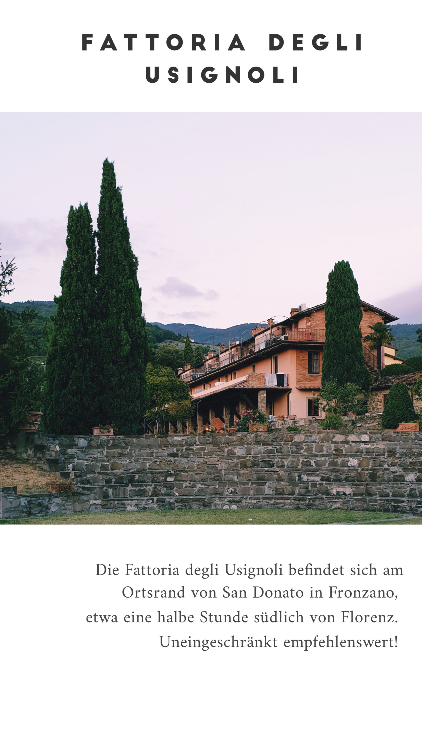 Das schöne daran ist, dass man auf diese Weise an Orte kommt, die man sonst vielleicht niemals gesucht hätte. Wie zum Beispiel unsere letzte Unterkunft. Die Fattoria degli Usignoli. Ein altes Gehöft, das früher von Mönchen genutzt wurde, um dort Landwirtschaft und Weinbau zu betreiben. Jetzt wird es nur noch zum Ferien machen genutzt. Es erinnerte mich immer ein bisschen an das Ambiente aus „Dirty Dancing“… Das tollste aber war unser riesiges Zimmer mit Terrasse und direktem Zugang zum grossen Pool. Das haben wir sehr genossen.
