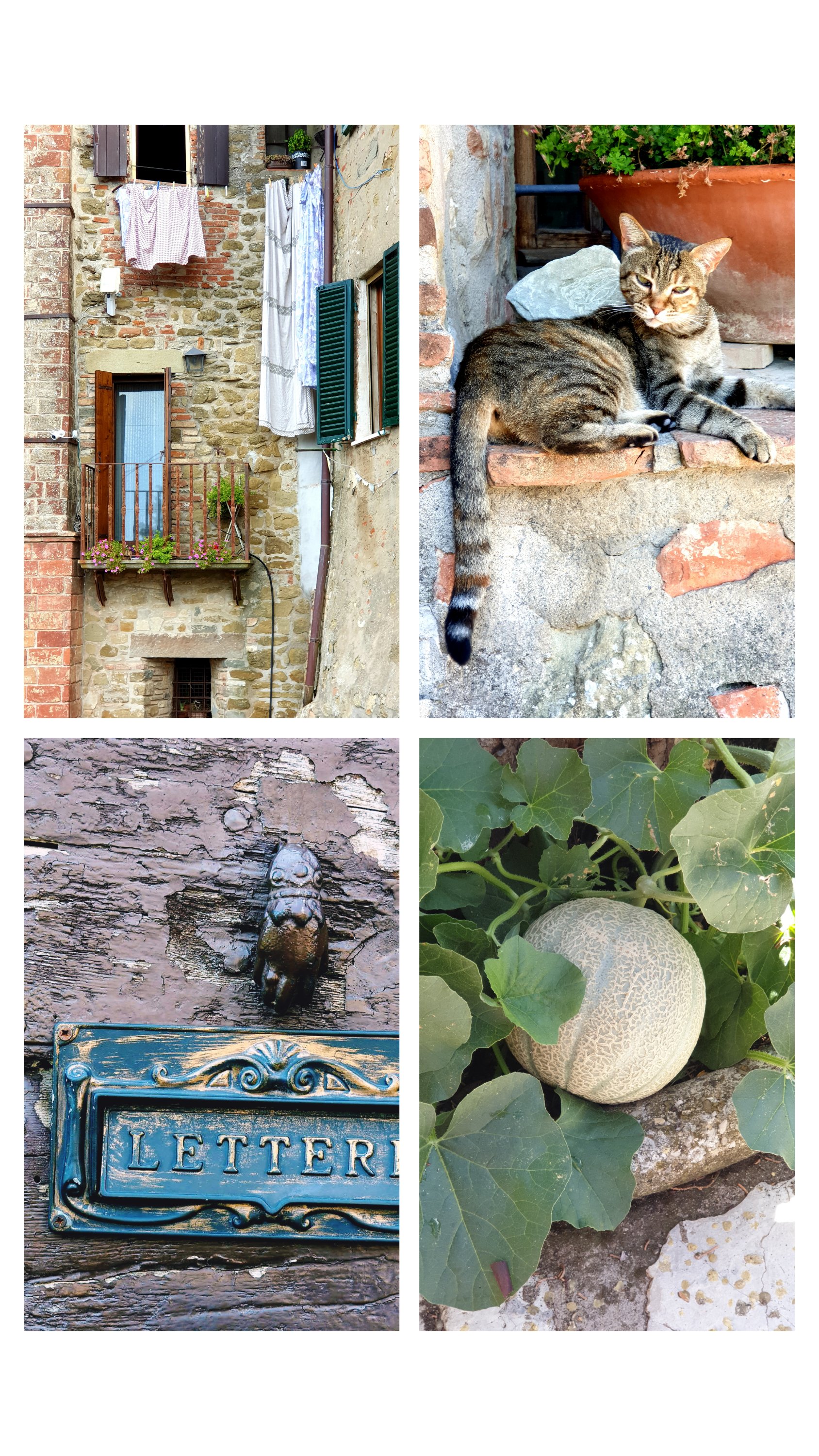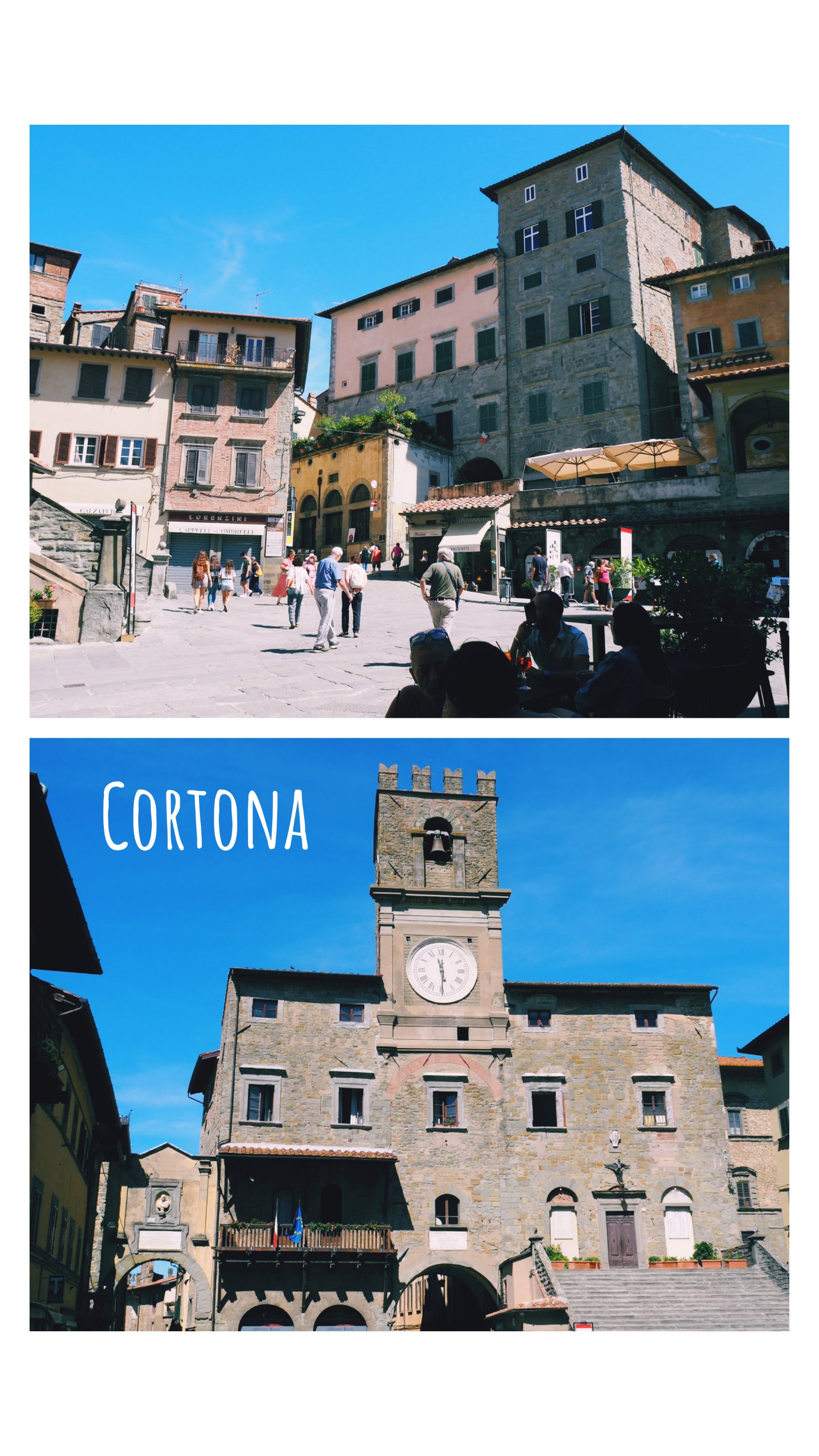 Gestern morgen sind wir nach einem sehr typischen italienischen Frühstück (Cornetto und Cappuccino) in ein kleines Örtchen namens Cortona gefahren. Ich hatte davon zuvor noch nie gehört. Es war so zauberhaft, ebenfalls am Hügel gelegen, konnte man unterhalb des Ortes parken und von dort in die engen Gassen eintauchen. Es war vormittags, und das bedeutete, dass es recht belebt war. Bars und Cafés waren geöffnet und auf dem Hauptplatz spielte ein Akkordeon, während ein Hochzeitspaar samt Fotograf gerade das Rathaus verließ. Wir setzten uns an einen schattigen Tisch am Rande der Piazza und beobachteten das bunte Treiben.