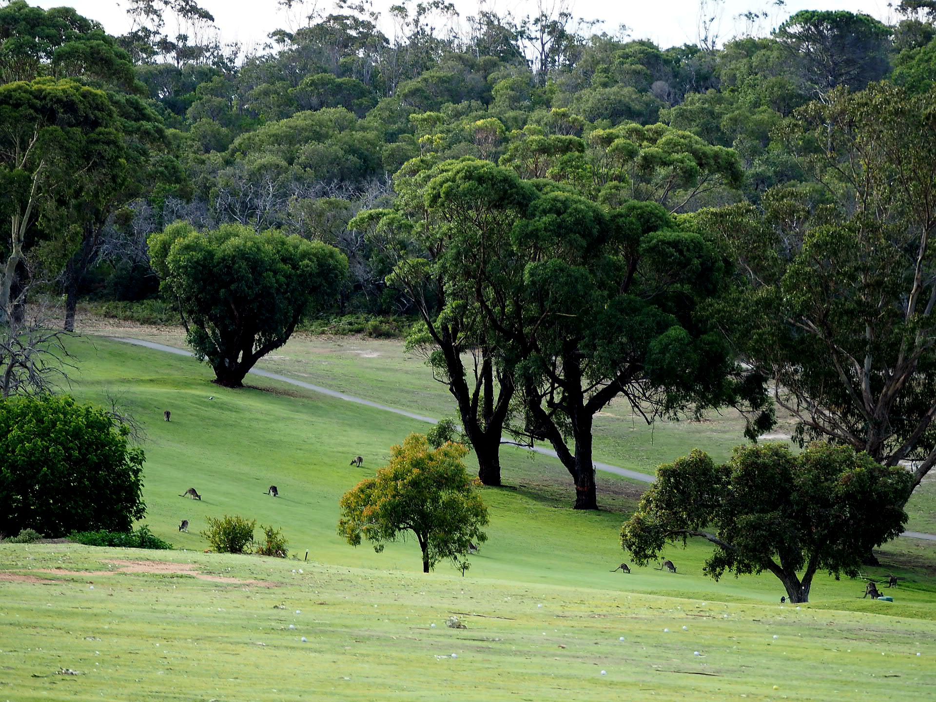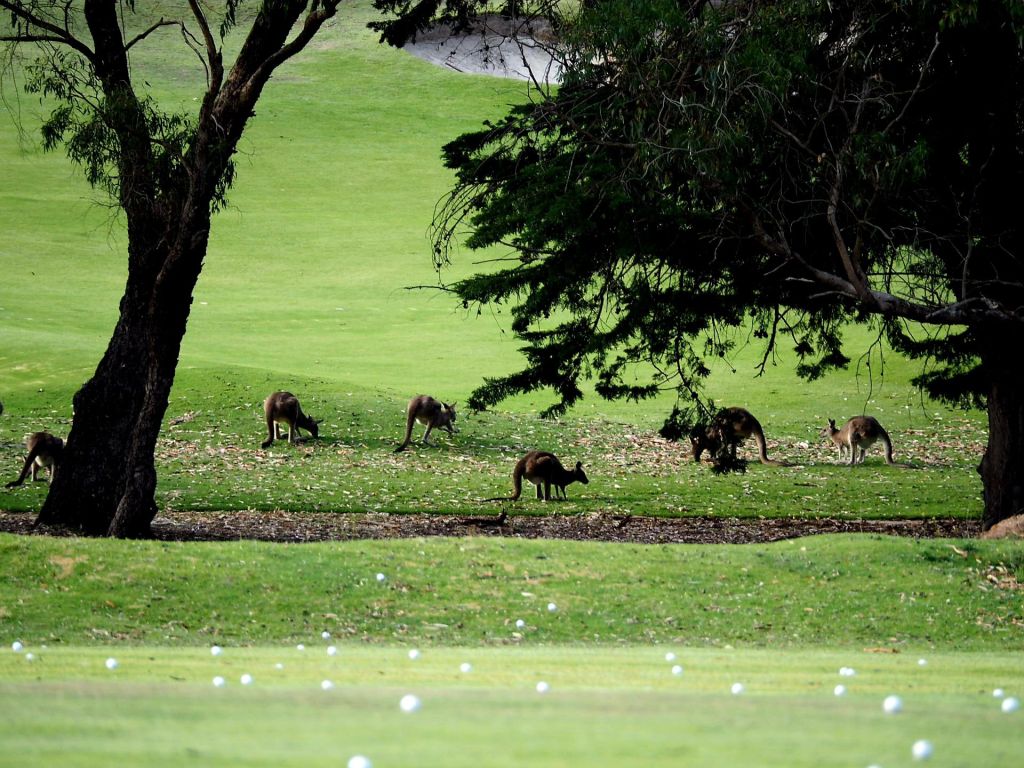 Zu guter Letzt brachte uns der Fahrer dann in ein Wohngebiet mit angeschlossenem Golfplatz. Dort auf einmal tauchten sie auf, mindestens 20 Kängurus sassen verteilt auf dem glattgeschorenen Golfrasen und knabberten vor sich hin. Aaaaah, das ist kaum zum Aushalten. Echte, wildlebende Roos (wie die Aussies sagen). Wir konnten unser Glück gar nicht fassen. Ich liebe einfach solche Tiersichtungen. Stundenlang könnte ich da einfach nur sitzen und zuschauen.