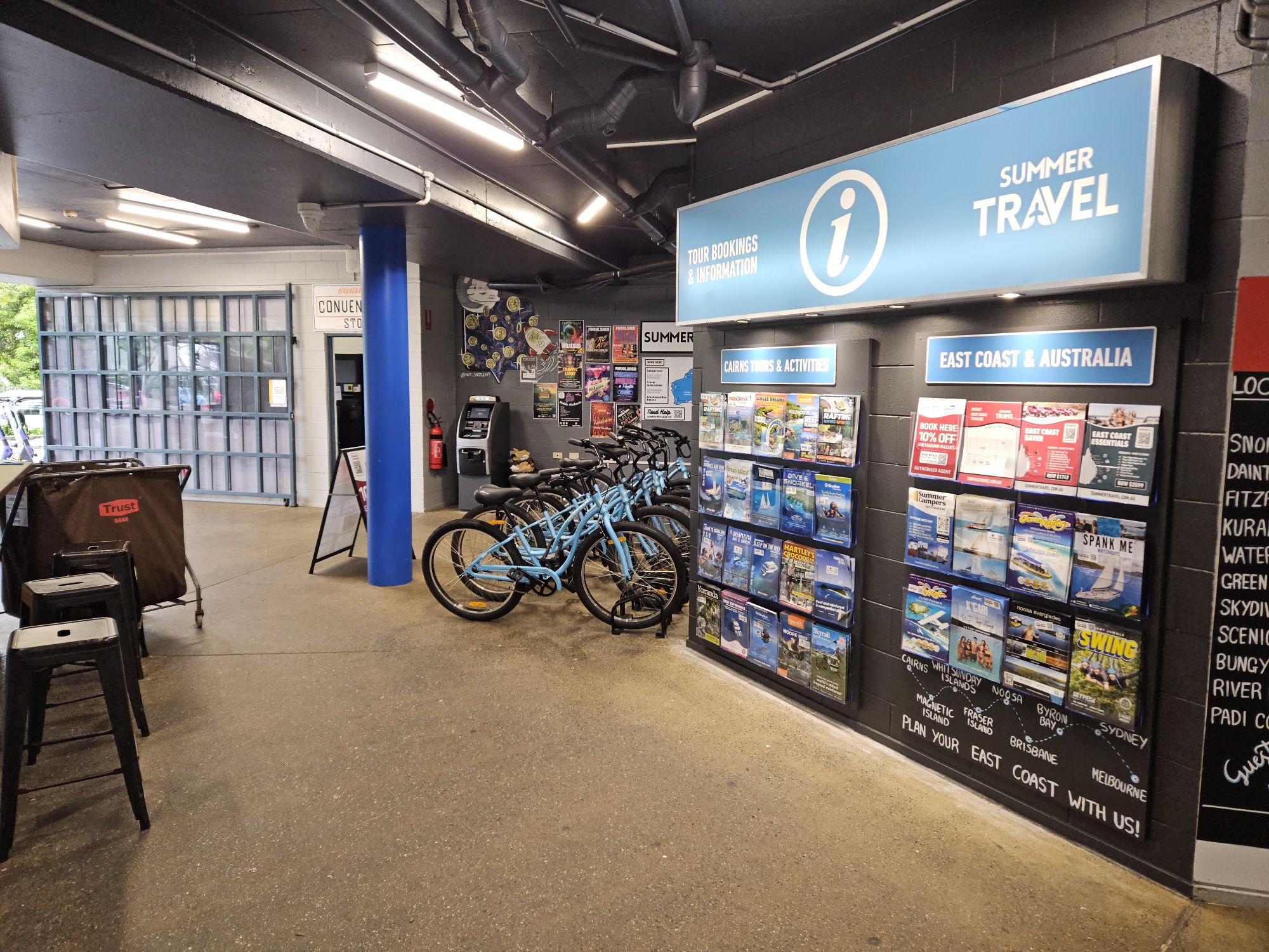 Das Foyer der Herberge mit kostenlosen Fahrrädern zum Ausleihen und allerlei Tourangeboten.