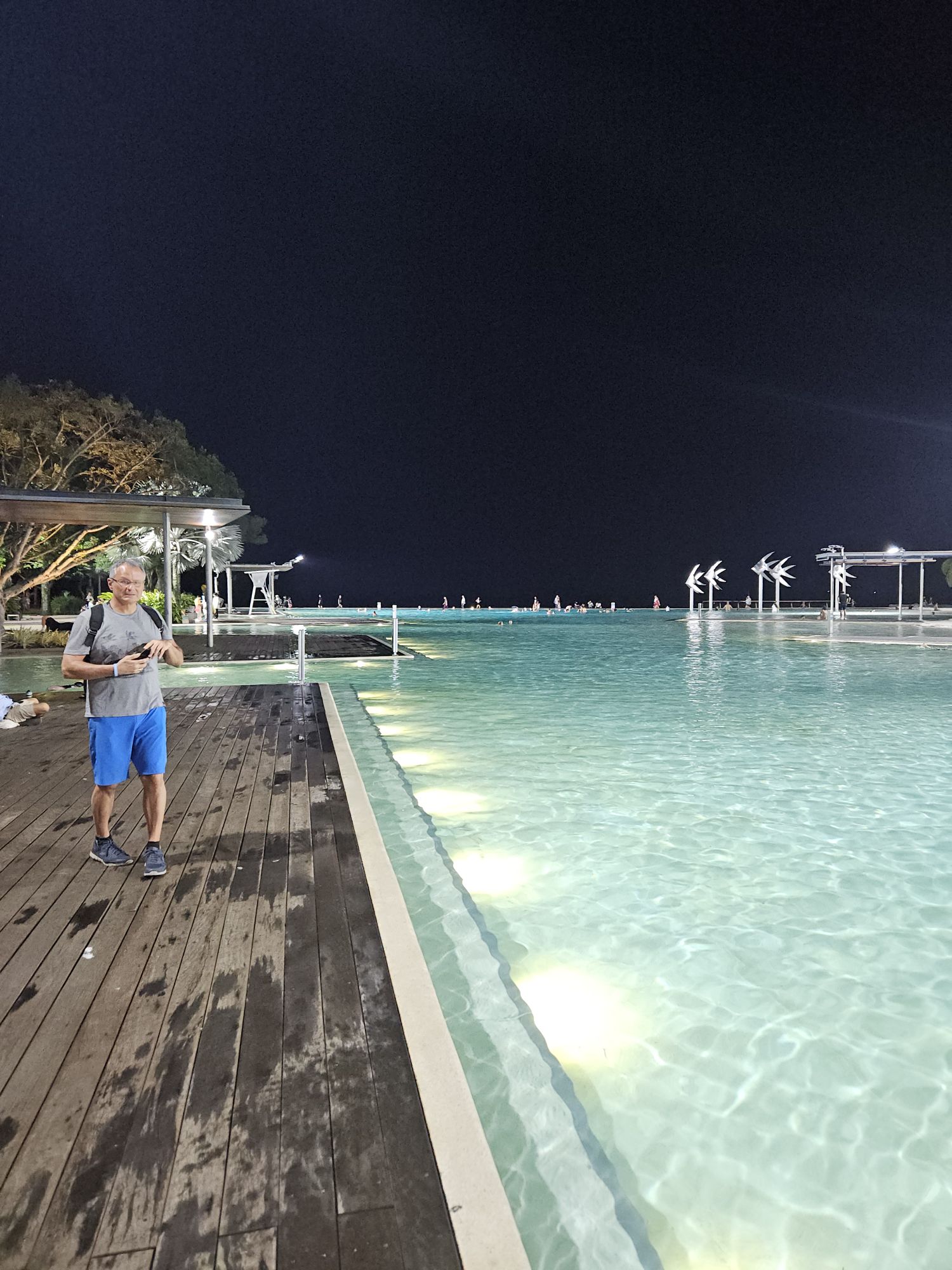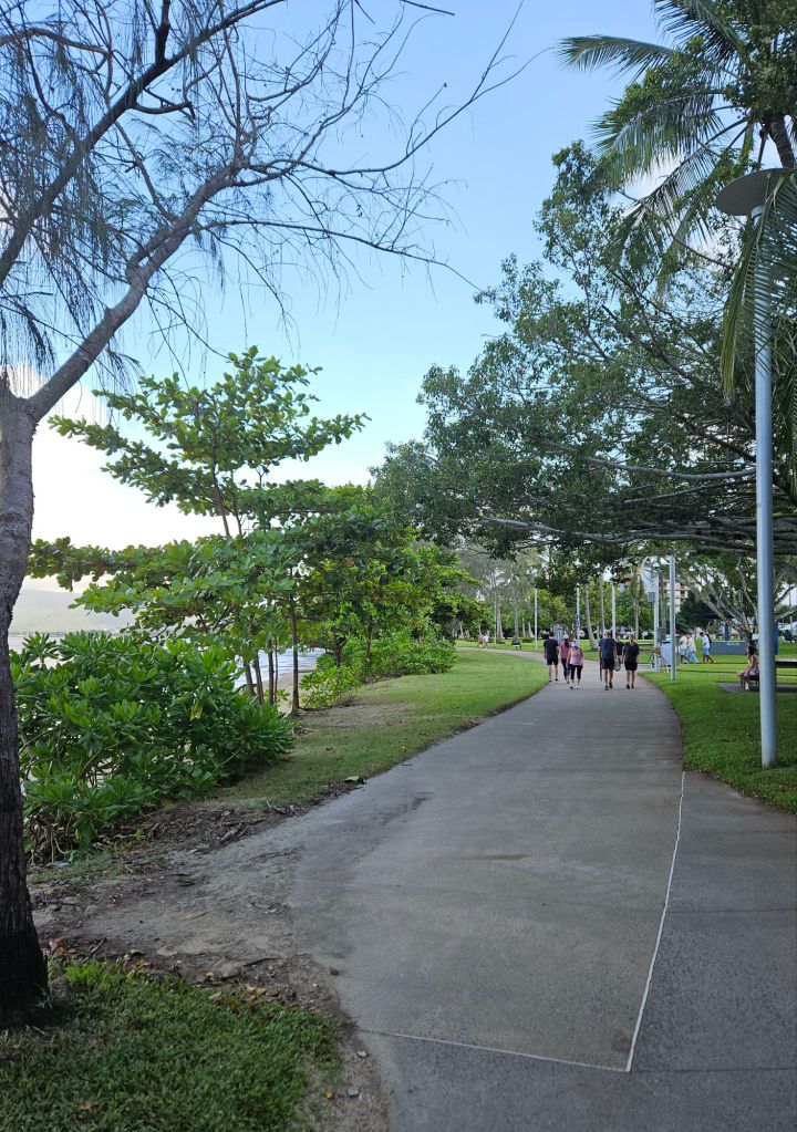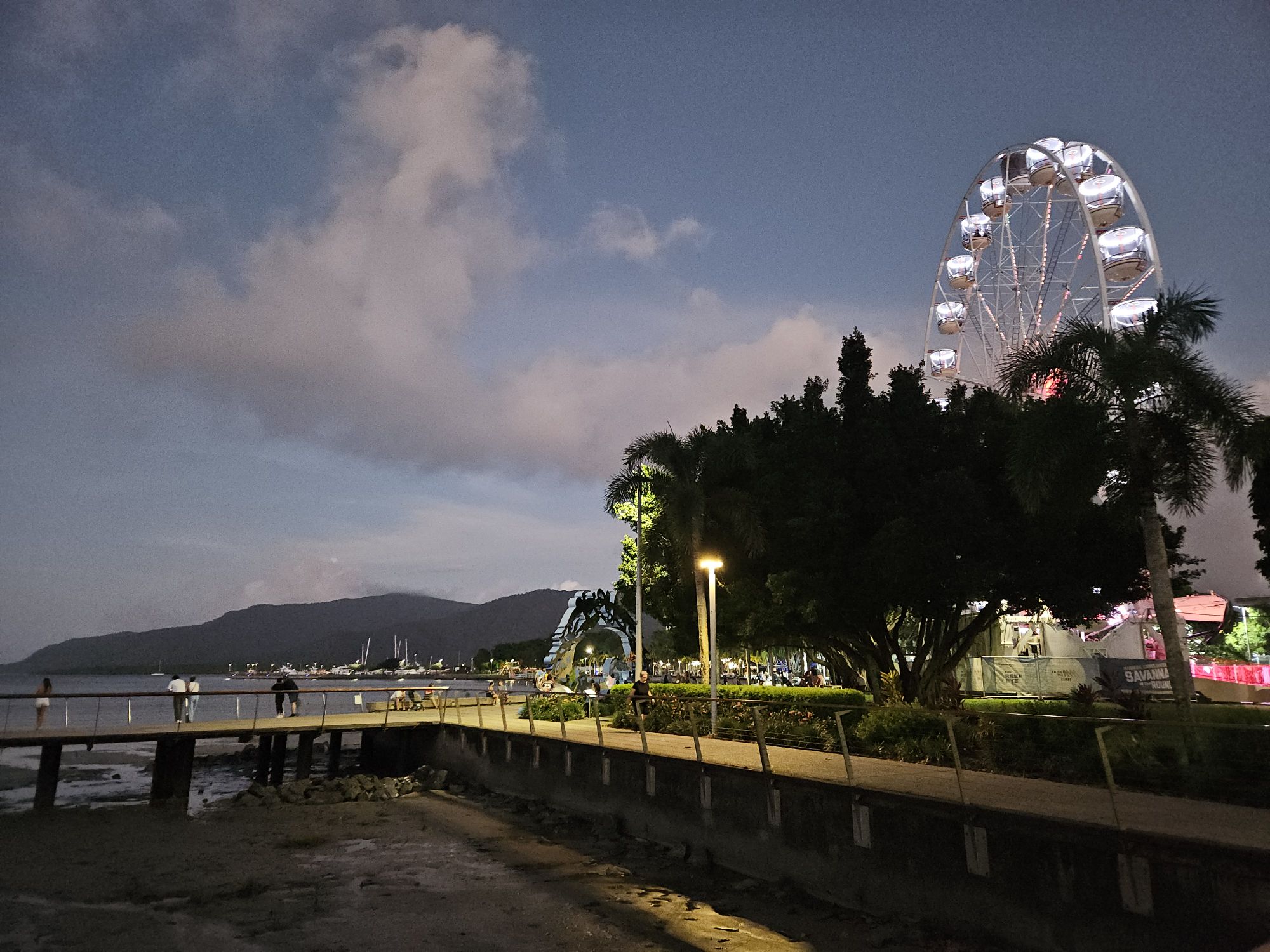 Am Freitag Abend sind wir bei der tollen Luft vom Hostel am Meer entlang bis ins Zentrum von Cairns gelaufen. Das war wirklich ein so schöner Spaziergang, den ich unbedingt in meiner Erinnerung behalten möchte. Die Atmosphäre war einfach toll. Die Restaurants waren aufgrund des Feiertags picke-packe voll und überall wurde gegrillt, Jogger liefen vorbei und in den Bäumen versammelten sich die bunten Regenbogen Aras mit lautem zwitschern. Der grosse Pool war noch geöffnet und die Leute planschten und genossen die laue Abendluft. Ein buntes Riesenrad drehte sich zu sanfter Musik.