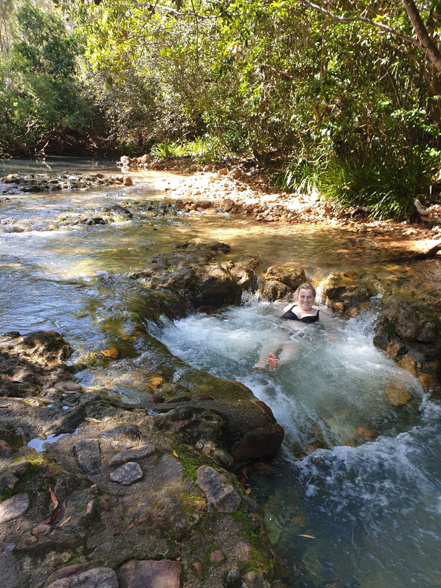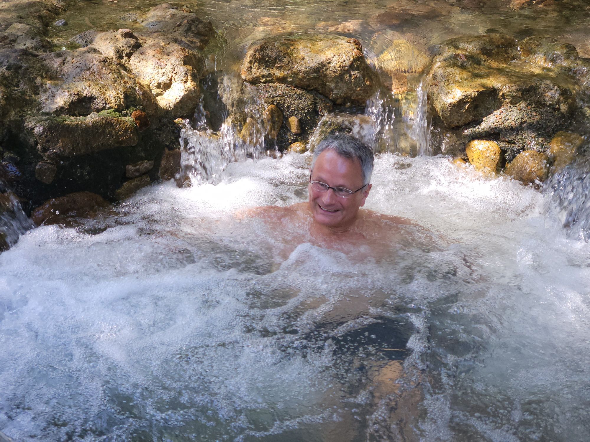So erreichten wir dann unser Ziel, den türkisblauen Caldwell Spa Pool, eine Vertiefung in einem normalen Bachbett mit einem kleinen Wasserfall, wo man eine Art natürlichen Whirlpool herein modelliert hat. Wir waren zunächst ganz alleine, zogen unsere Badesachen an und stiegen in das angenehm kühle Gewässer. Spaeter kamen dann noch ein paar andere, aber es war dennoch angenehm leer. Ganz anders als bei den Bustouren. Die türkis-blaue Farbe entsteht übrigens durch bestimmte Mineralien im Untergrund des Gewässers.