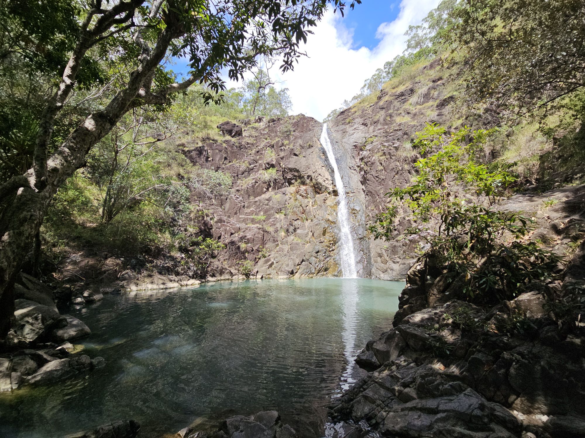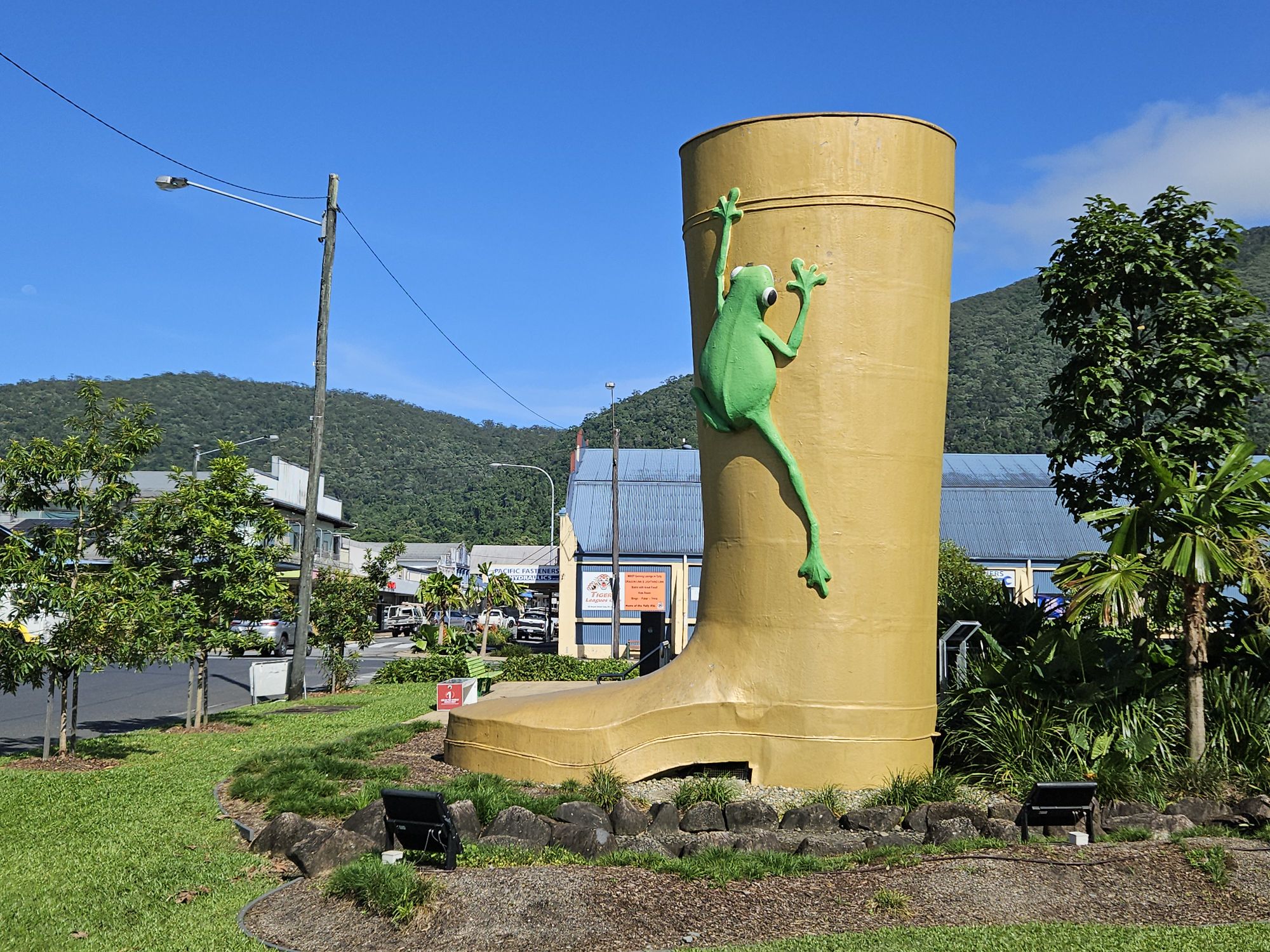 Um 9.00h waren wir schon wieder auf der Straße und Kai hat uns fuer den Tag drei Highlights rausgesucht. Ich habe aber nochmal die KI befragt, und die sagte, es sei noch unbedingt lohnenswert den grossen goldenen Gummistiefel in Tully zu fotografieren 😂 Der steht hier symbolisch fuer den regenreichsten Ort an der Küste von Queensland.