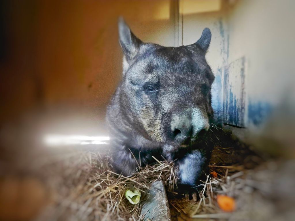 Und hier mal ein echtes Wombat in seinem Kämmerchen. Er kann natuerlich von da aus ins Freigehege und hat ein riesiges unterirdisches Tunnelsystem.