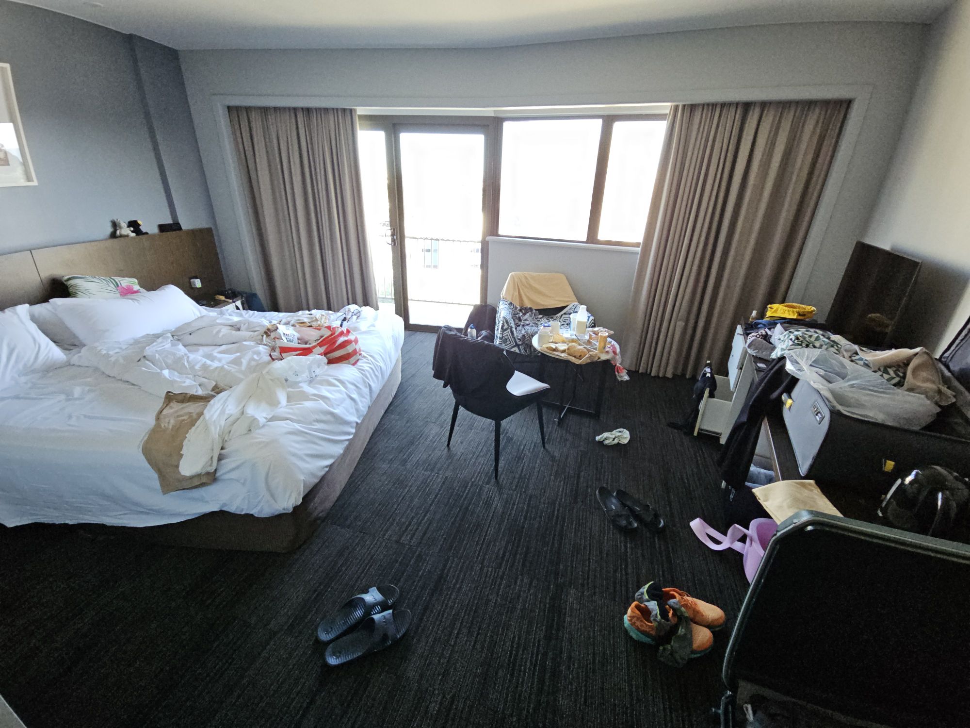 Nach einem spartanisch Frühstück im Doppelzimmer ging die Packroutine los. Bisher funktioniert das System tadellos. Auch wenn es auf diesem Bild gerade nicht so aussieht 🤣 habe ich ziemlich genau 12 Minuten gebraucht, um das Chaos wieder zu beseitigen.