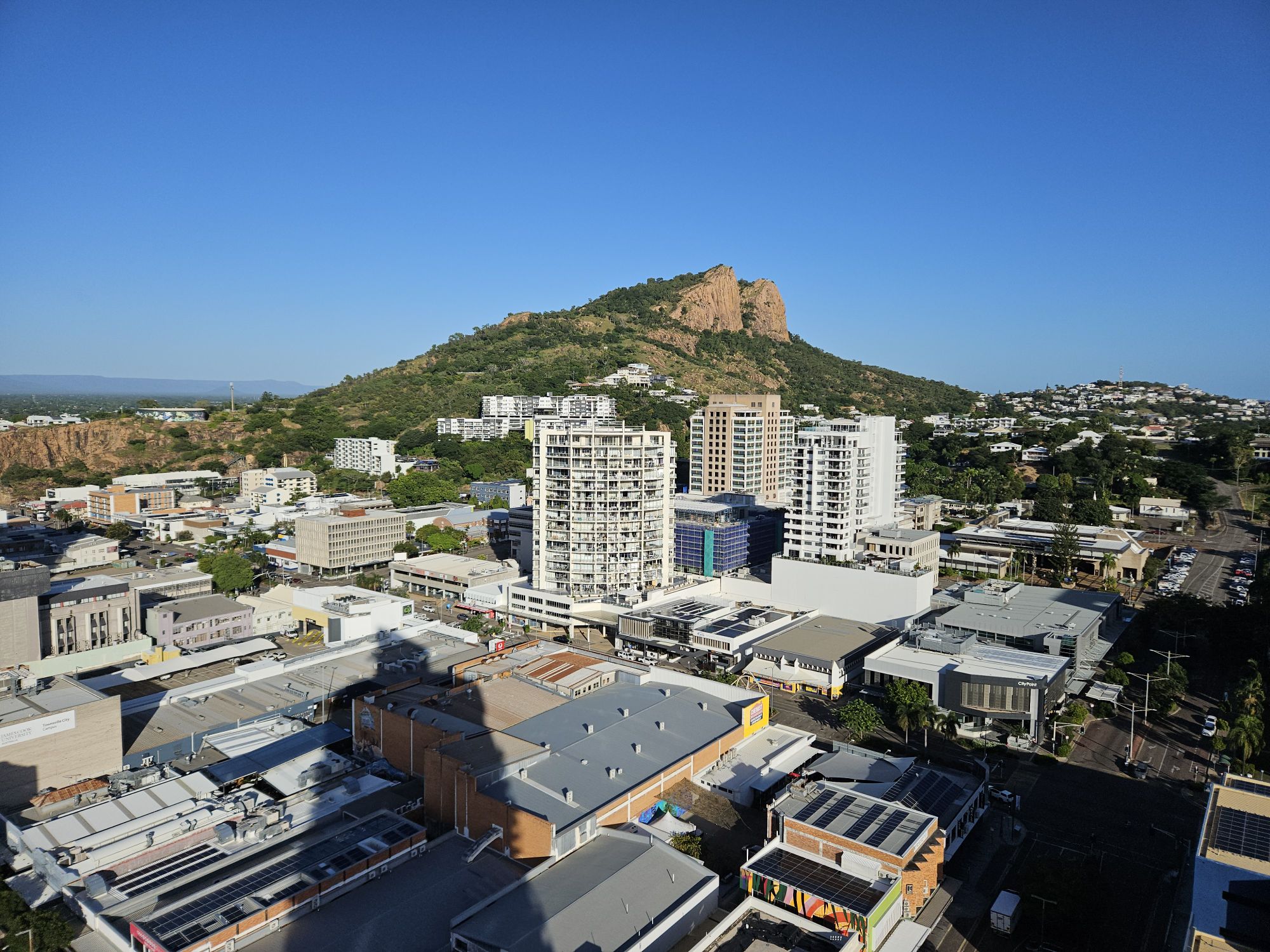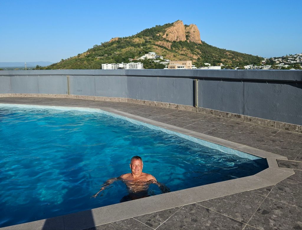 Wieder ein neuer  Tag auf der Route nach Süden. Ein ganz normaler Mittwoch. Wie immer starteten wir den mit einem kurzen Sprung in den Pool. Dieser war heute etwas Besonderes, er befand sich hoch oben im 20. Stock des Grand Chancellor Hotels in Townsville. Die Aussicht von oben war natuerlich toll.