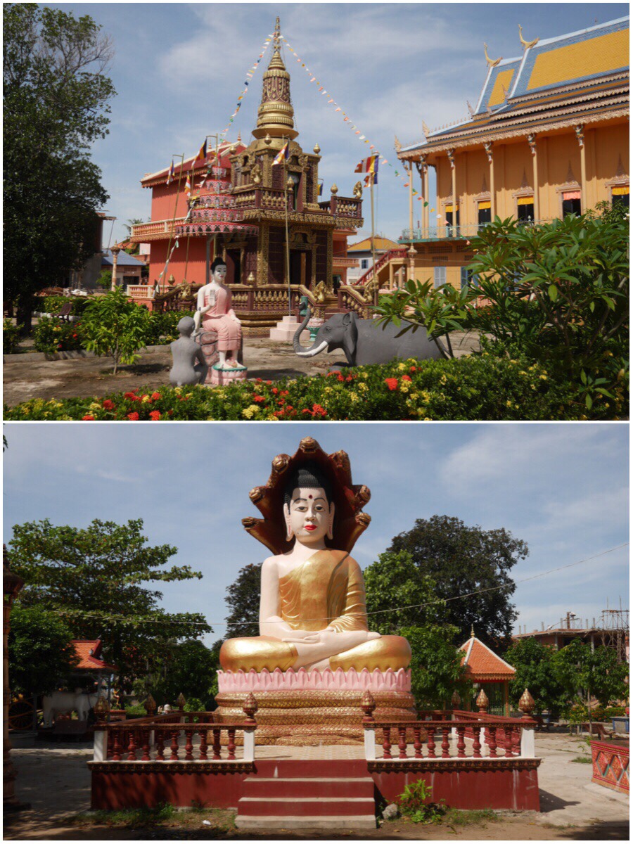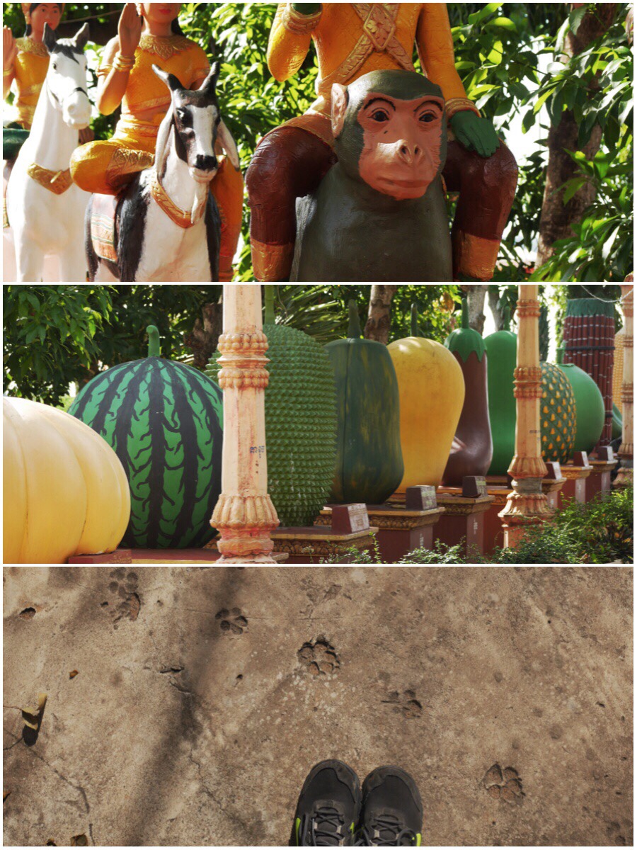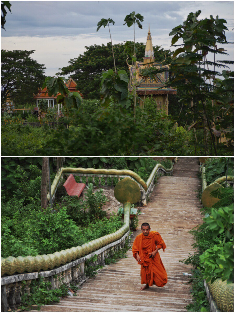 Der erste Stop war eine der zahlreichen Höhlen, die es in dieser Gegend gibt. Die Höhle mit einem gut erkennbaren weißen Elefanten an der Wand. Inmitten ein uralter Tempel in Stein gemeißelt und entlang der verfallenen Treppe mit der Schlangenbalustrade gab es wunderschöne Ausblicke über die weite bewirtschaftete Landschaft. Wieder unten angekommen, gab es einen kleinen Getränkestop und wir fuhren weiter zu einem verborgenen See, der noch aus der Pol Pot Ära stammte. Unser kleiner Guide erzählte uns stolz, dass er extra zwei Jahre in Phnom Penh war, um sein Schulenglisch aufzubessern und sich privat sehr für die Geschichte seines Landes interessiert, um eben diese den Touristen näherbringen zu können. Ich schätzte ihn auf Anfang 20, er hatte bereits Frau und Kind in arbeitet tagsüber als Tuk Tuk Fahrer und abends im Hotel, wenn er dann mal Zeit hat, kümmert er sich um sein Reisfeld.