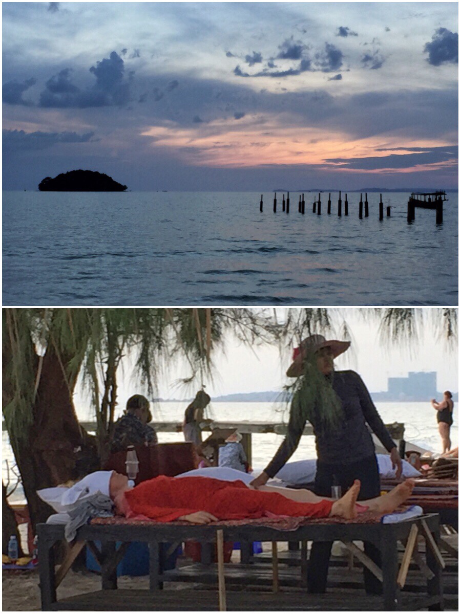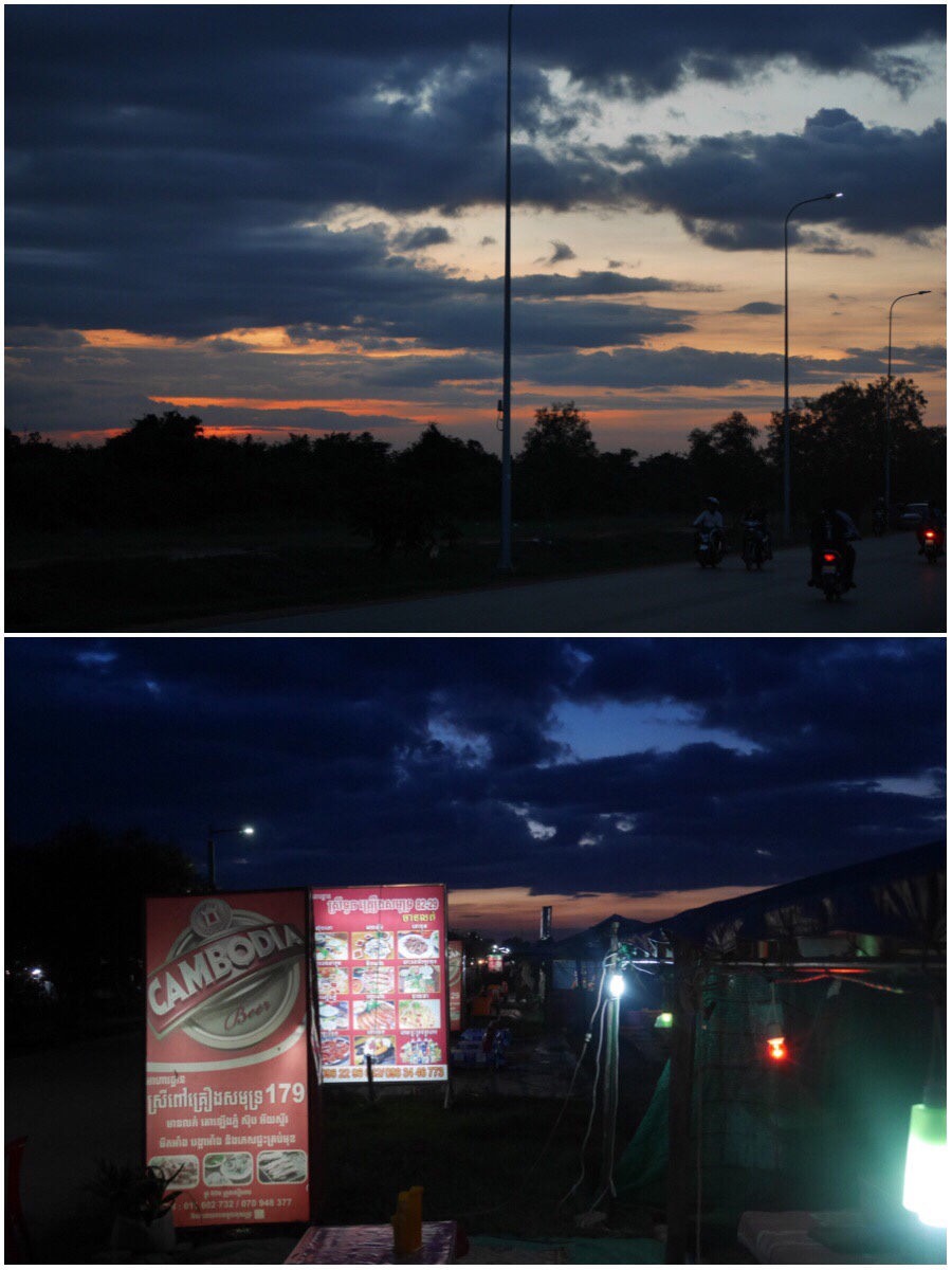 Unseren letzten Abend zelebrierten wir mit einem Tischgrillen, wie wir es vor knapp einer Woche in Siem Reap erlernt hatten. Nach dem dinner nahmen wir ein Getränk in einer Bar und durften nochmal einen richtig schönen, kräftigen Tropenschauer erleben. Gemütlich unter der Markise sitzend beobachteten wir die Fahrer der Tuk Tuks, wie diese ihre Fahrzeuge in sekundenschnelle regensicher machten. Das schöne an diesem Regen war vor allem, dass die schwülheisse Luft des Tages abgekühlt wurde. Mit dem leicht prasselnden Regen auf unser Palmblatt gedecktes Hüttchen schliefen wir wohlig ein.