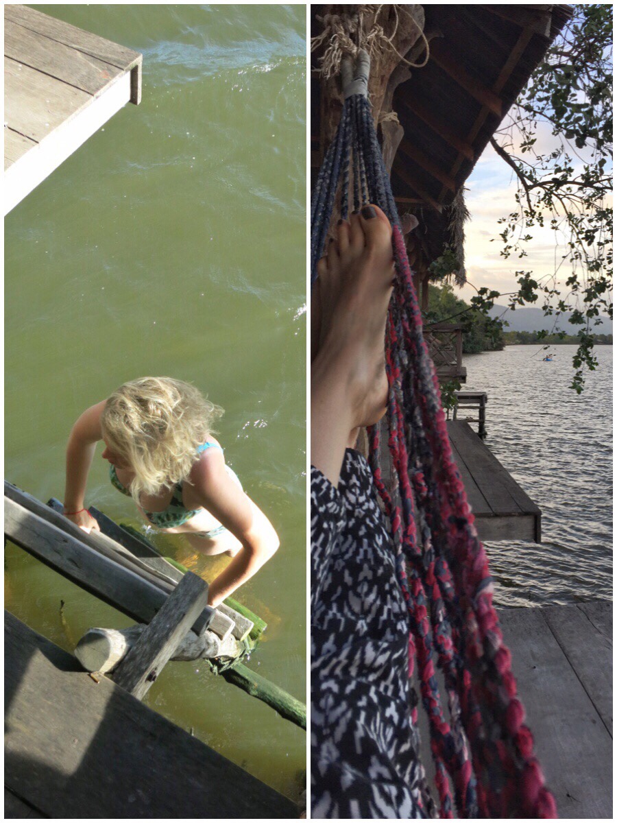In Kampot angekommen, haben sich schon die Tuk Tuk Fahrer um uns geschart und ehe wir uns versahen, kamen wir auch schon im zauberhaften Ramo Resort an. Resort hört sich immer etwas größer an, als es ist … in diesem Fall handelte es sich um eine sehr einfach Unterkunft ohne warmes Wasser, Klimaanlage oder sonstige Annehmlichkeiten. Dafür lag unsere kleine Holzhütte mit Palmdeckung direkt am Flussufer mit einer fantastischen Terrasse und einem zauberhaften Detail, welches von einem von unser immer in Beschlag genommen wurde. Eine Hängematte direkt am Wasser.