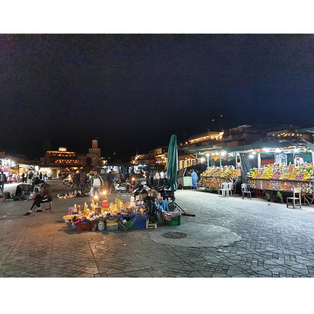 Gestern Abend sind wir recht spät in der Altstadt angekommen. Wir konnten dieses Mal unser kleines Riad ohne Problem in einer der Seitengassen finden. Das Riad Thagazoud war unsere Herberge fuer die erste Nacht. Wir haben kurz unser Gepäck abgestellt und sind direkt durch die belebten Straßen zum grossen Hauptplatz, dem berühmten Djeema El Fna gelaufen. Es war genauso wie ich es in Erinnerung hatte und aus den zahlreichen Garkuechen dampfte und brutzelte es glücklicherweise noch. Denn es war schon nach 11 und wir hatten Hunger. Es gab eine Tajine, fuer mich eine mit Huhn, Rosinen und Zwiebeln, fuer den Gemahl gab es irgendein Fleisch, Pflaumen und Mandeln, dazu warmes Brot und ein paar Dips. Geschmacksmässig ist da noch Luft nach oben, aber die tolle Atmosphäre macht das wieder wett.