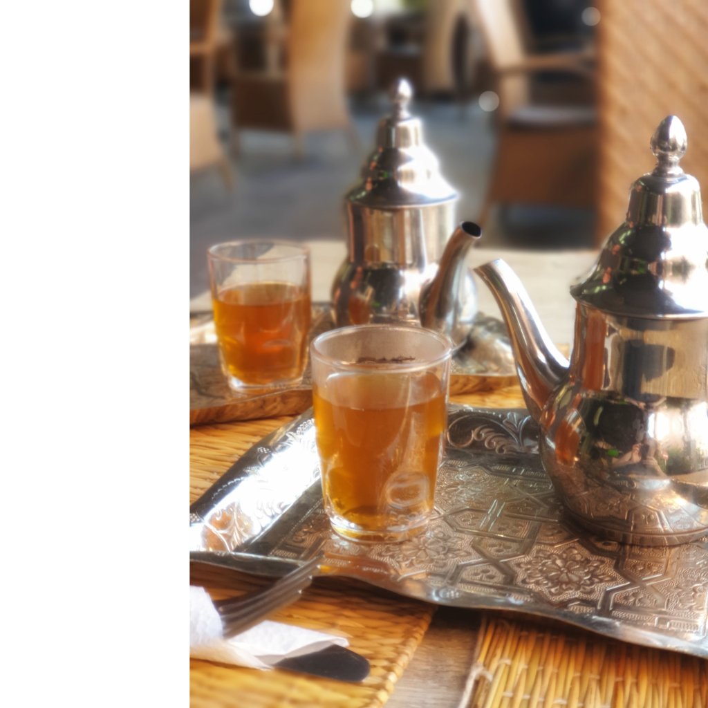 Nach dem Besuch im Souk gab es den ersten Minztee auf einer Terrasse mit Blick auf das bunte Treiben unten auf dem Platz. Später haben wir das Gepäck abgeholt, und sind mit dem Bus in das nächste Hotel gefahren. Das Hotel Les 3 Palmieres ist der Ausgangspunkt fuer unser 9-tägige Rundreise durch Marokkos Süden.