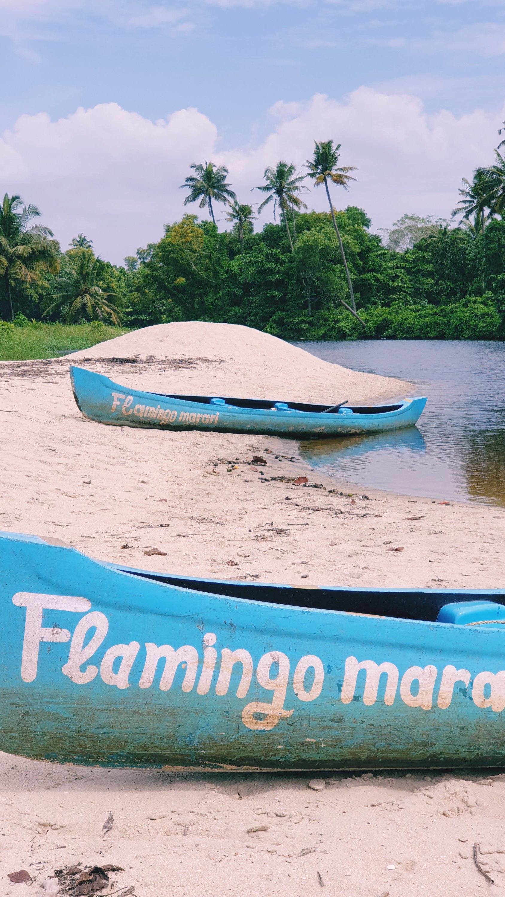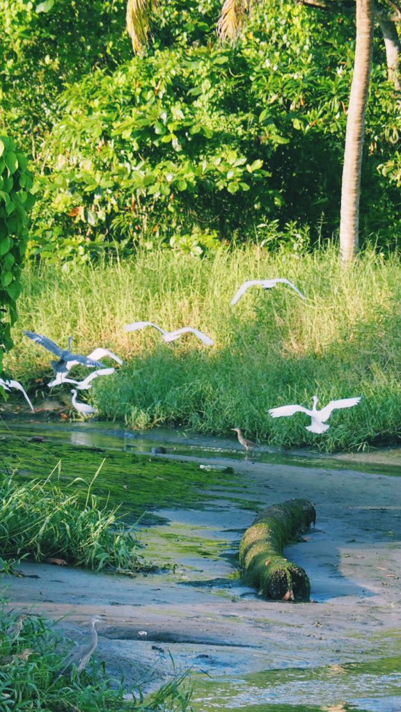 Nach dem Frühstück haben wir uns eins der Kanus gemietet, mit denen man direkt vom Kanal am Hotel aus bis vorne ans Meer rudern kann. Das hat grossen Spass gemacht und man konnte auf diese Weise die sehr lebendige Vogelwelt entlang des dicht bewachsenen Ufers bewundern. Schwarze Kormorane und weisse Kraniche waren dabei am häufigsten zu sehen. Vorne am Meer gab es eine flache Stelle, an der wir anlegen konnten um noch ein bisschen die Seeluft einzuatmen.